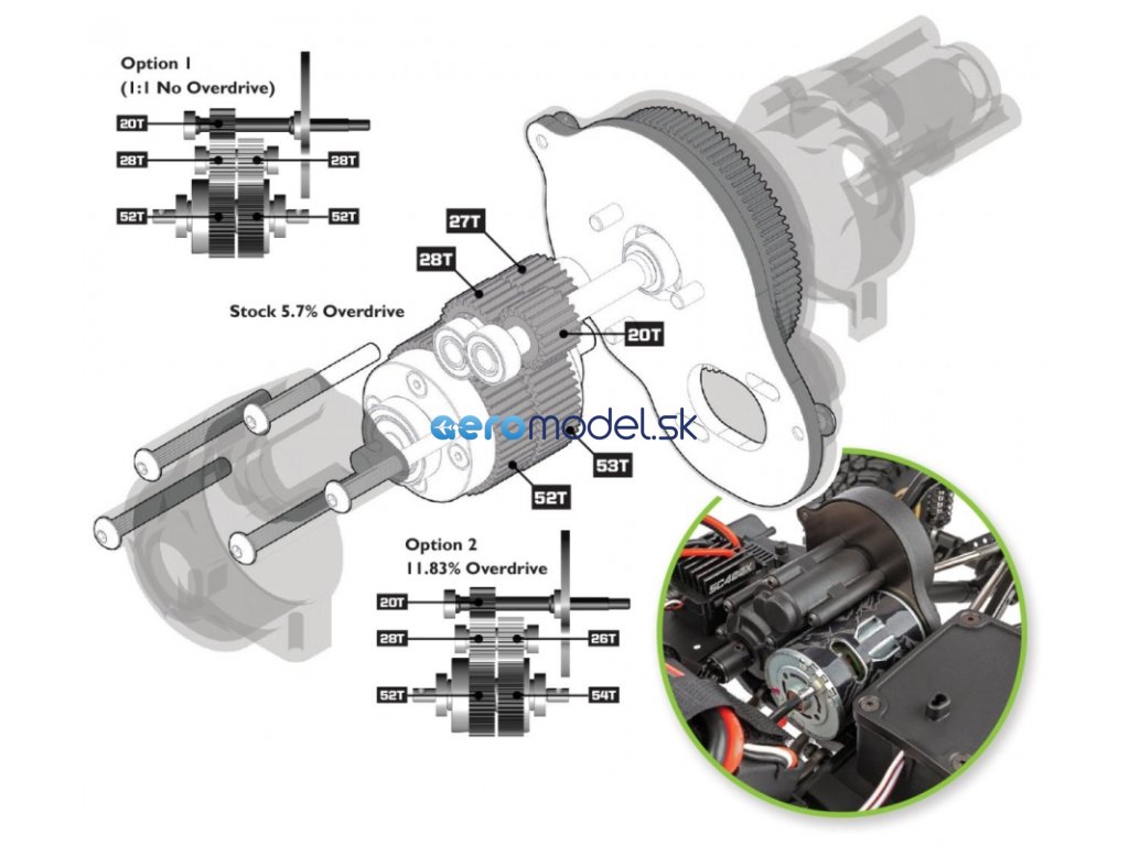 Srdcem modelu Enduro je naše revoluční převodovka Stealth (R) X. Ačkoli zvenku vypadá jako běžná třístupňová převodovka, uvnitř zdaleka běžná není. Převodovka Stealth (R) X se vyznačuje možností nastavit převodový poměr zadního pohonu nezávisle na předním pohonu ve třech úrovních: sériová převodovka přeřazuje předek o 5,7 % (instaluje se do RTR), volitelná varianta 1 poskytuje převodový poměr předek-zadek jedna ku jedné (k dispozici samostatně) a volitelná varianta 2 přeřazuje předek o 11,83 % (součástí RTR).