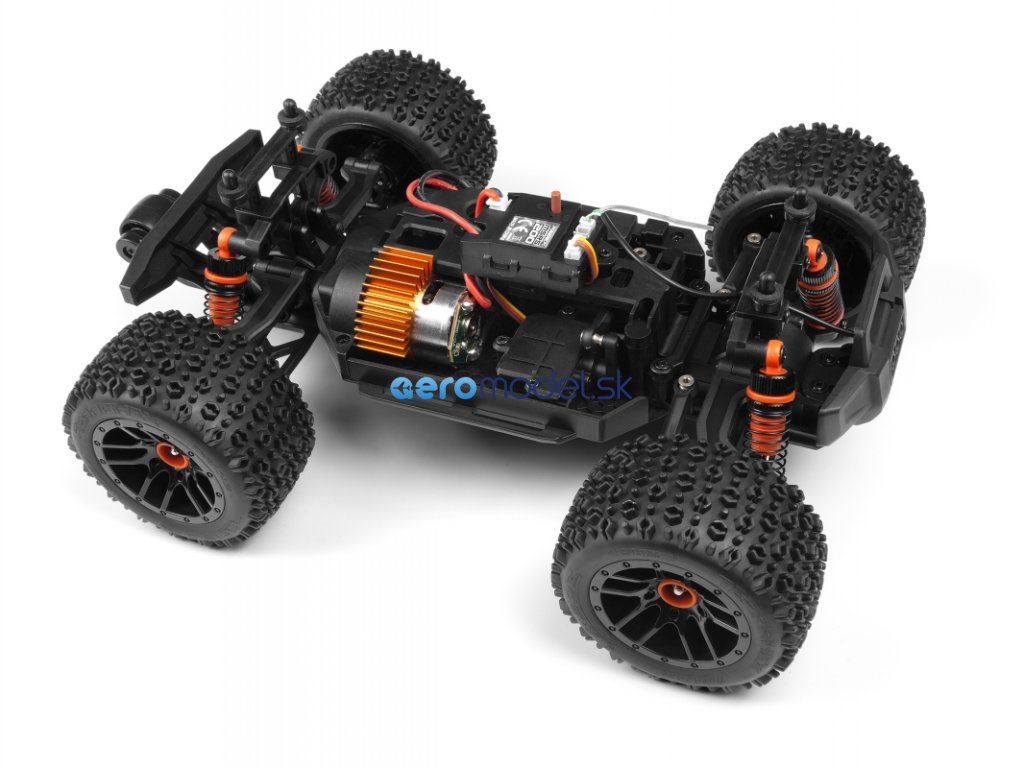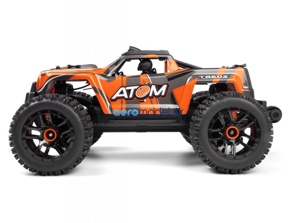 Základnu monster trucku ATOM tvoří lehká a pevná konstrukce podvozku s šestiúhelníkovým vystužením. Boční nárazové lišty chrání spodní okraj karoserie. Všechny čtyři tlumiče mají závity, umožňující snadné nastavení světlé výšky.