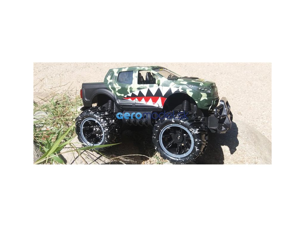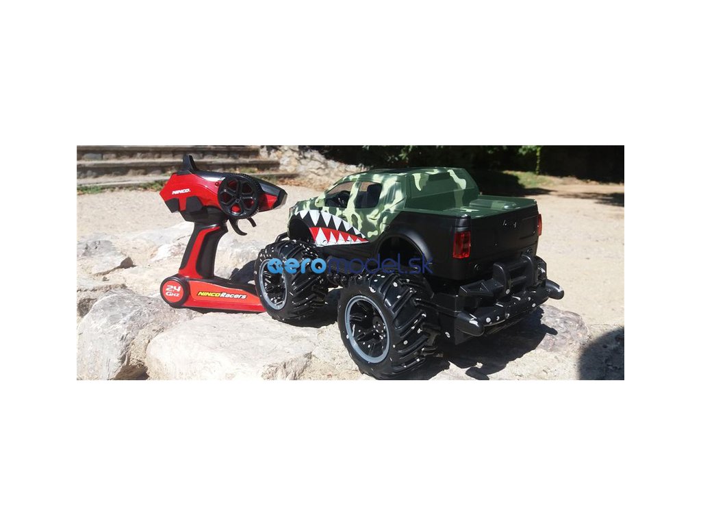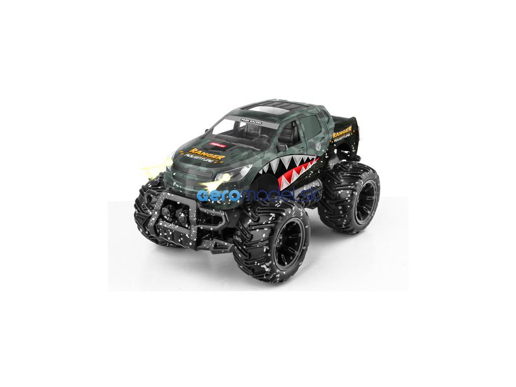 Detská terénna RC hračka Nincoracers Ranger v mierke 1:14 s dĺžkou 30 cm patrí do módnej kategórie Monster Truck. Má obrovské kolesá s pneumatikami do náročného terénu. Dokáže prejsť akýmkoľvek terénom, zdolávať strmé svahy a prekonávať veľké prekážky. Karoséria je vyrobená z odolného plastu. Má zelené a čierne maskovacie armádne sfarbenie. Má priehľadné okná, cez ktoré môžete vidieť krásne spracovaný interiér modelu. Podvozok má na bokoch atrapy výfukov a v prednej časti masívny ochranný rám. Zadnú nápravu poháňa výkonný jednosmerný motor. Model dokáže zrýchliť až na 15 km/h. Skvelým prvkom sú LED svetlomety, vďaka ktorým môžete zažiť dobrodružstvo nočnej jazdy v teréne.
