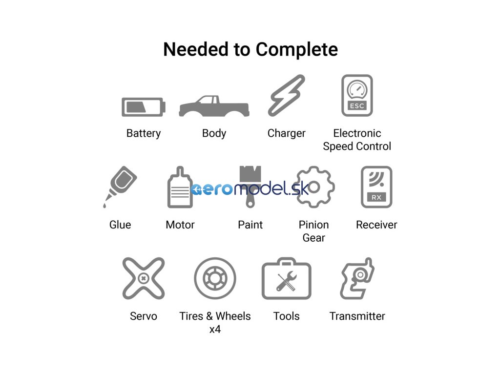 Ak sa rozhodnete postaviť si špeciál Pro Comp Scaler 1:10 4WD, na dokončenie stavby budete potrebovať nasledujúce komponenty: