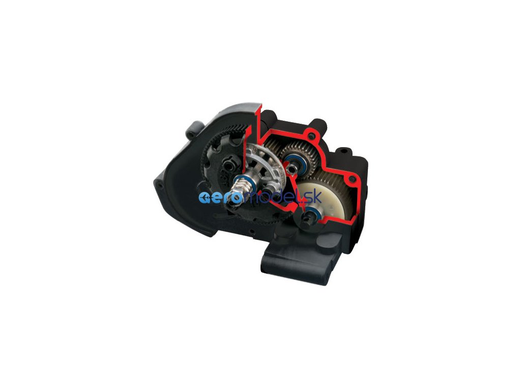 Převodovka, disková spojka a planetový diferenciál jsou uzavřeny do jednoho kompaktního celku. Převodovka s třecí spojkou spolehlivě přenáší výkon motoru na nápravy, planetová převodovka diferenciálu Magnum 272™ má ozubená kola vyrobená z kalené oceli. Tento systém vyžaduje naprosto minimální údržbu. K dispozici jsou pastorky a ozubená kola s různými počty zubů, takže si můžete model přesně vyladit pro rychlostní i technické tratě.