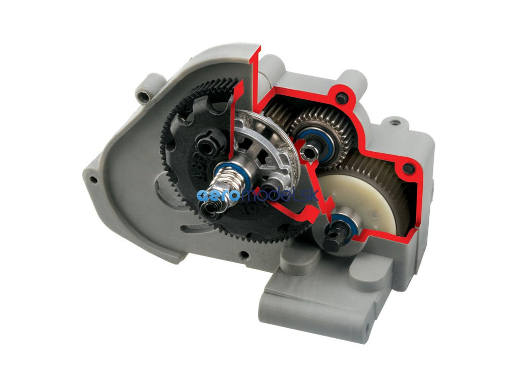 Převodovka, disková spojka a planetový diferenciál jsou uzavřeny do jednoho kompaktního celku. Převodovka s třecí spojkou spolehlivě přenáší výkon motoru na nápravy, planetová převodovka diferenciálu Magnum 272™ má ozubená kola vyrobená z kalené oceli. Tento systém vyžaduje naprosto minimální údržbu. K dispozici jsou pastorky a ozubená kola s různými počty zubů, takže si můžete model přesně vyladit pro rychlostní i technické tratě.