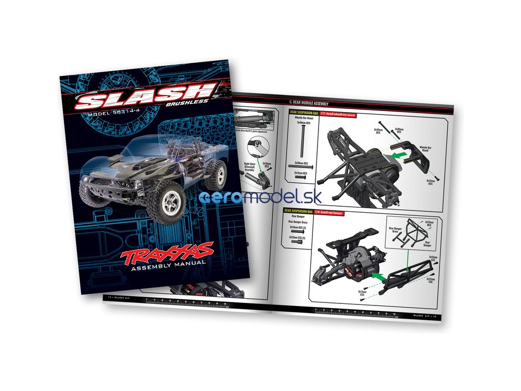 Balení obsahuje díly pro stavbu RC modelu auta Traxas Slash 1:10 BL-2s a elektroniku: střídavý motor 3300ot/V, střídavý regulátor BL-2S, servo Traxxas 2075, přijímač 2.4GHz 3 kan. TQ. Traxxas vysílač 2.4GHz 2 kan. TQ, čirou nenabarvenou karoserii a kola s pneumatikami. Příslušenství: klíč imbus (1.5, 2, 2.5 mm), křížový klíč, klíč na čepy, klíč na spojovačky, klíč antény. Návod CZ a obrázkový manuál pro stavu EN, DE, FR, SP.
