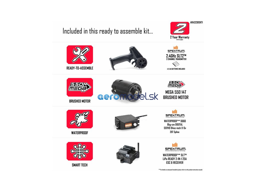 2kanálový vysílač Spektrum SLT kombinuje bezpečné řízení na frekvenci 2,4 GHz s kvalitou Spektrum™ pro spolehlivost. Jednotka Spektrum 2-v-1 obsahuje regulátor otáček 25A a přijímač. Servo Spektrum S660 má vysokým točivý moment.