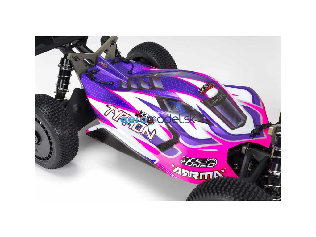 RC model auta na diaľkové ovládanie Arrma Tuned Typhon TLR v mierke 1:8 s pohonom 4x4, dodáva sa zostavený, bez elektroniky a pohonu. Je vybavený hliníkovými tuningovými dielmi TLR-Tuned a je pripravený na montáž príslušenstva. Hotová karoséria a pretekárske kolesá dBoots® Exabyte.