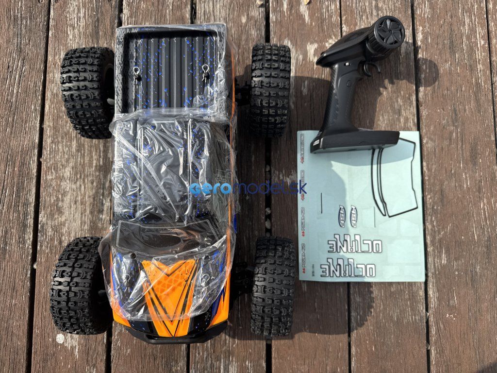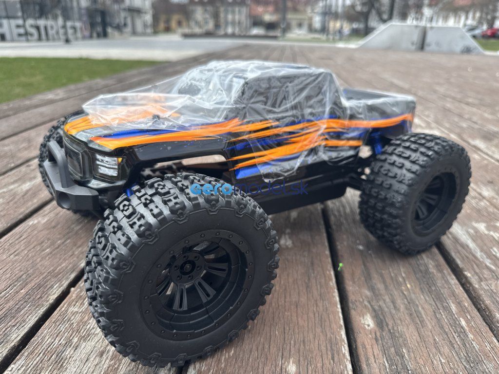 Model Monster Trucku v mierke 1:10 s pohonom všetkých kolies 4x4, poháňaný jednosmerným motorom vrátane. RC volantovej súpravy 2,4 GHz. Vodotesný 60A regulátor, prijímač a 15 kg servo. Bez pohonného akumulátora a nabíjačky. Oranžová karoséria.