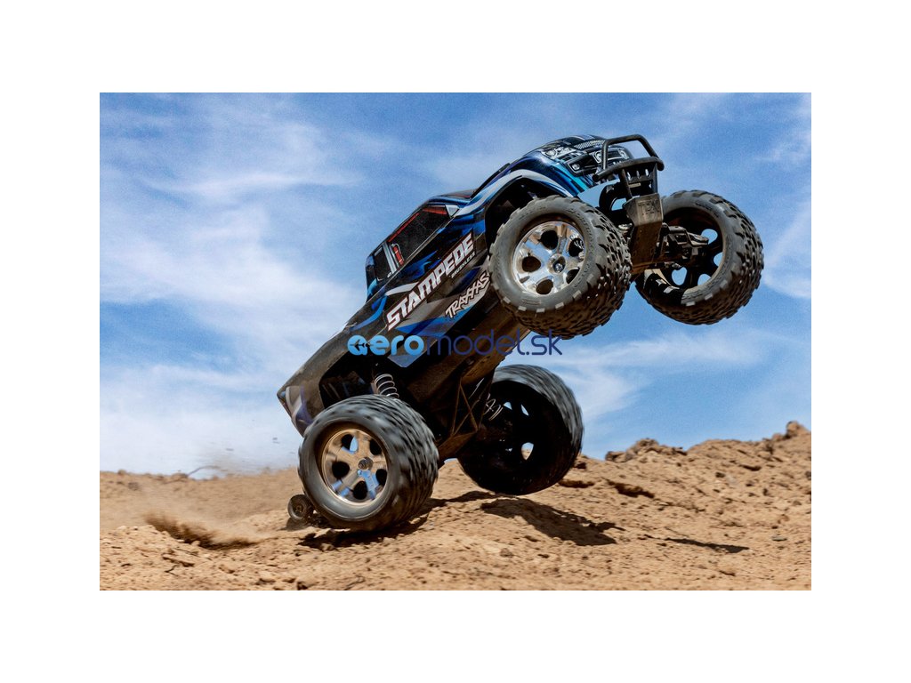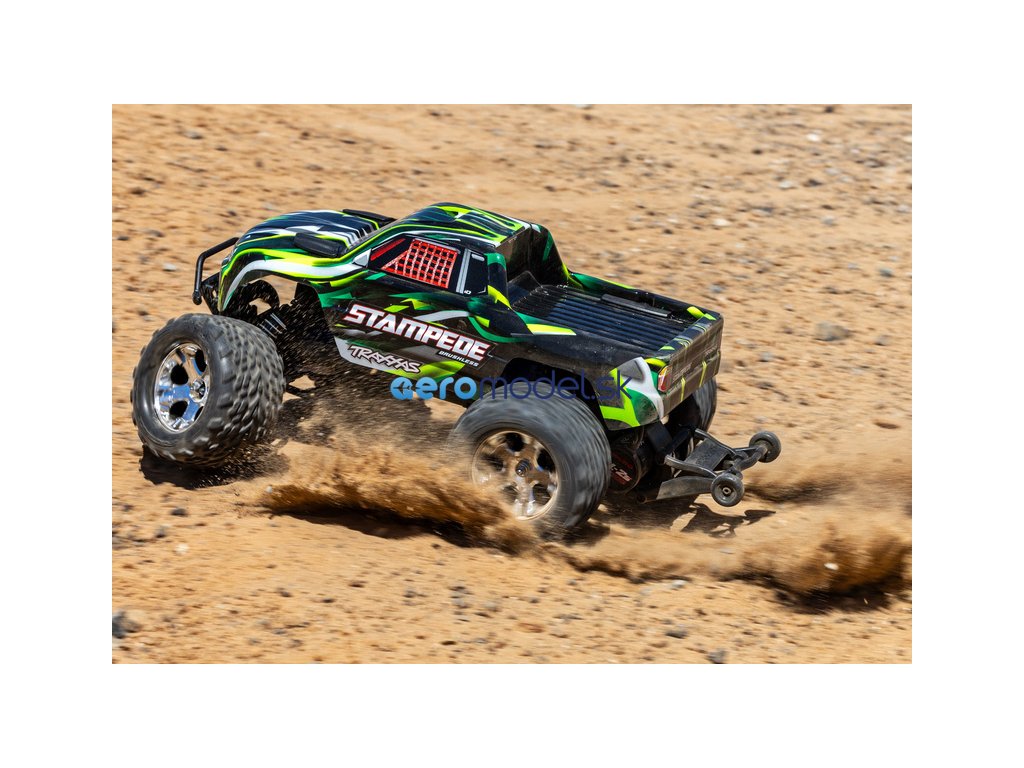 RC model auta Stampede 1:10 typu Monster Truck je poháněn střídavým motorem a regulátorem BL-2S pro napájení 2S LiPo akumulátory. Střídavý pohonný systém přináší brutálnější akceleraci, dlouhou životnost a rychlost modelu až 64 km/h. Navíc je model továrně vybaven sadou Extreme Heavy Duty pro vysokou odolnost a exkluzivním bez-sponkovým systémem upínání karoserie.