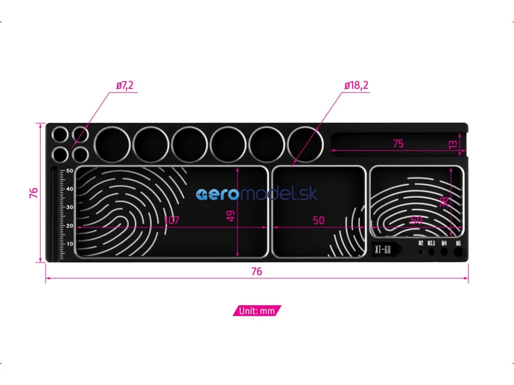 MIBO hliníkový stojánek poskytuje prostor pro 6 ks šroubováků, 4 ks bitů elektrického šroubováku, mobilní telefon a přihrádky pro uspořádání a ukládání drobných dílů a šroubků. Navíc obsahuje i integrovanou měrku pro rychlé měření délky šroubků a praktické otvory pro pájení konektorů typu XT60 a 2, 3,5, 4 a 5mm bullet. Díky tomu budete mít vše, co potřebujete, na jednom praktickém místě. Vaše práce s RC modely, elektronikou a jinými projekty tak bude organizovanější, rychlejší a efektivnější.