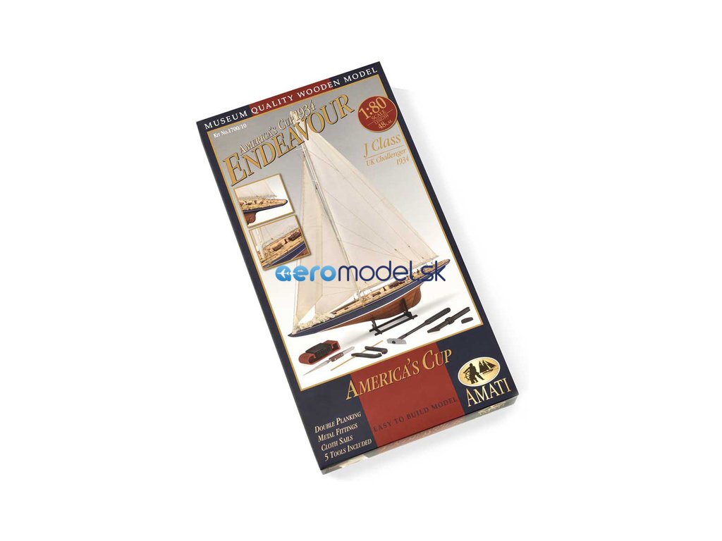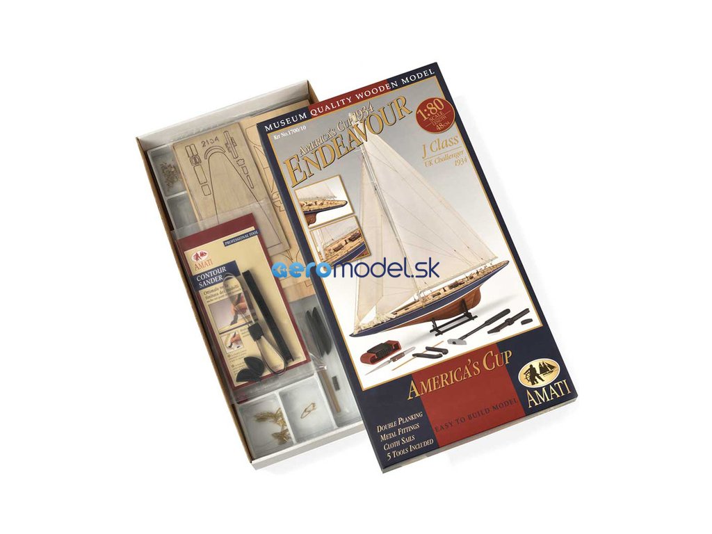 Stavebnice statické makety historické lodi AMATI Endeavour plachetnice 1934 1:80 kit. Škuner Endeavour slavil vítězství v prvním závodu Amerického poháru 1934. Dřevěné díly jako kýl a obšívka jsou řezány laserem, obsaženy jsou plachty, lanoví, doplňky. V balení je i sada nářadí.