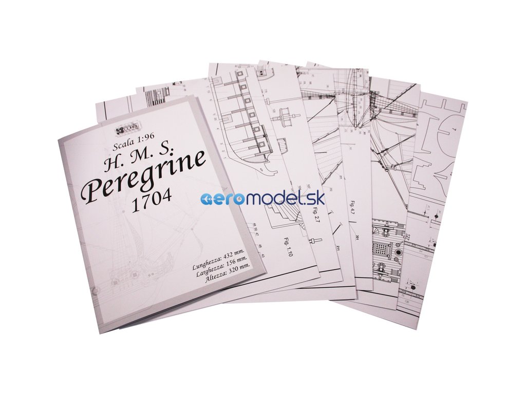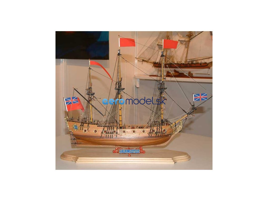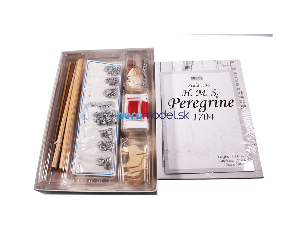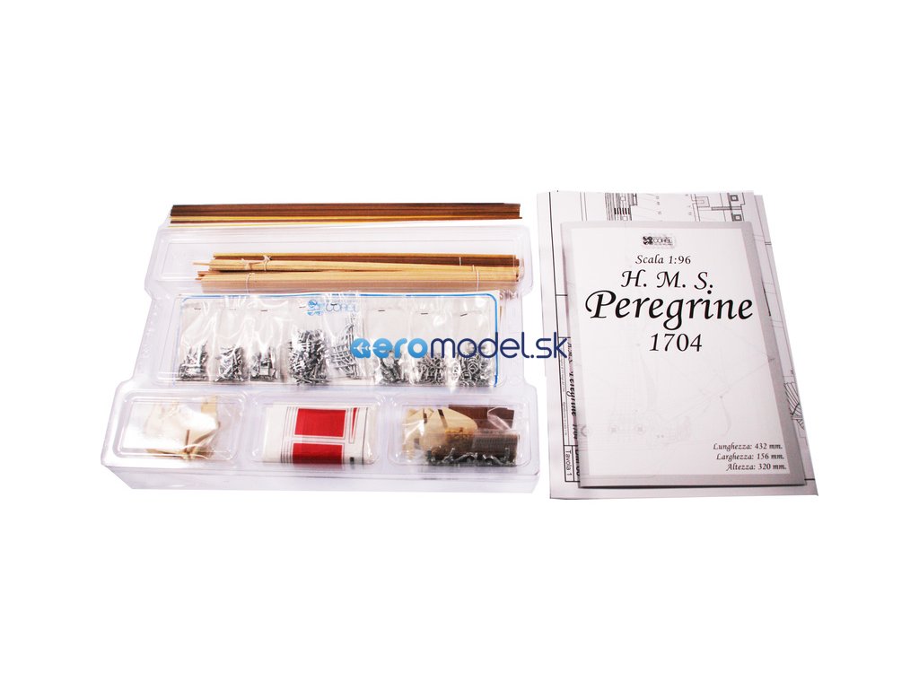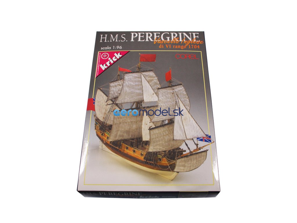 Stavebnice neplovoucího modelu COREL H.M.S. Peregrine v měřítku 1:96 z roku 1749 Kit. H.M.S. (His Majesty's Ship - loď Jeho Veličenstva) byl postaven v roce 1686 pro flotilu krále Jiřího III. Plán je velmi detailní, v balení jsou dřevěné díly, lišty a množství kování, lanoví, plátno na plachty a další.