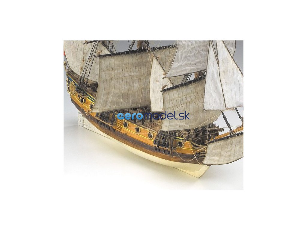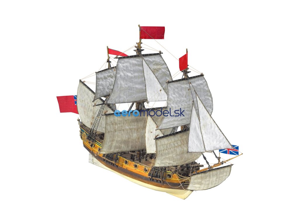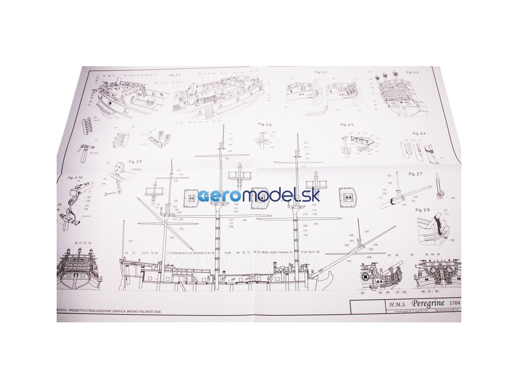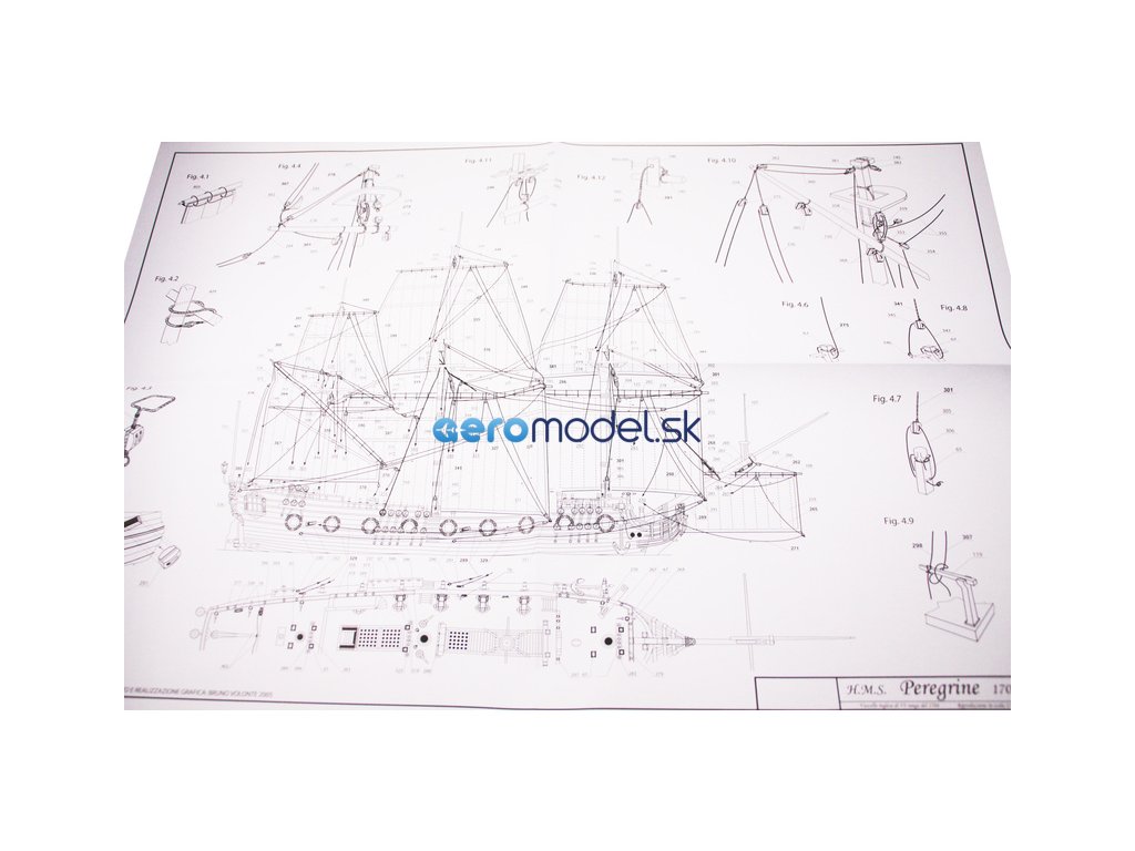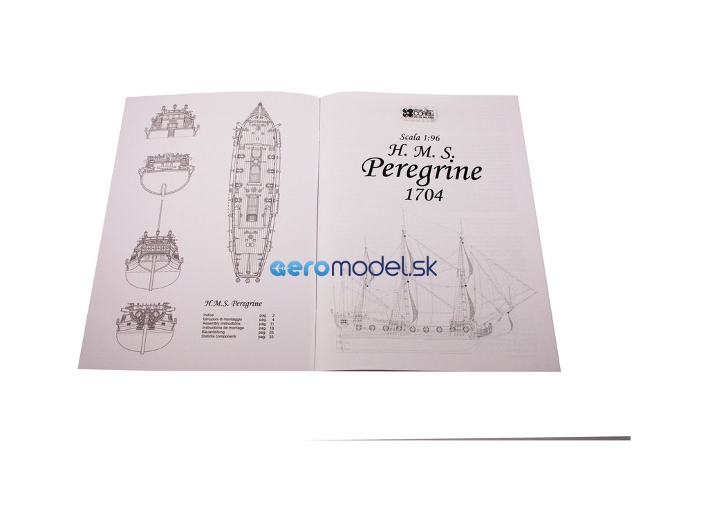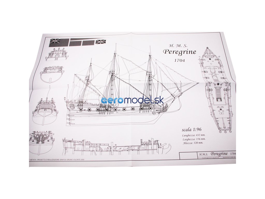 Stavebnice neplovoucího modelu COREL H.M.S. Peregrine v měřítku 1:96 z roku 1749 Kit. H.M.S. (His Majesty's Ship - loď Jeho Veličenstva) byl postaven v roce 1686 pro flotilu krále Jiřího III. Plán je velmi detailní, v balení jsou dřevěné díly, lišty a množství kování, lanoví, plátno na plachty a další.