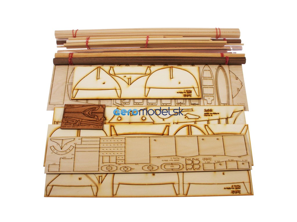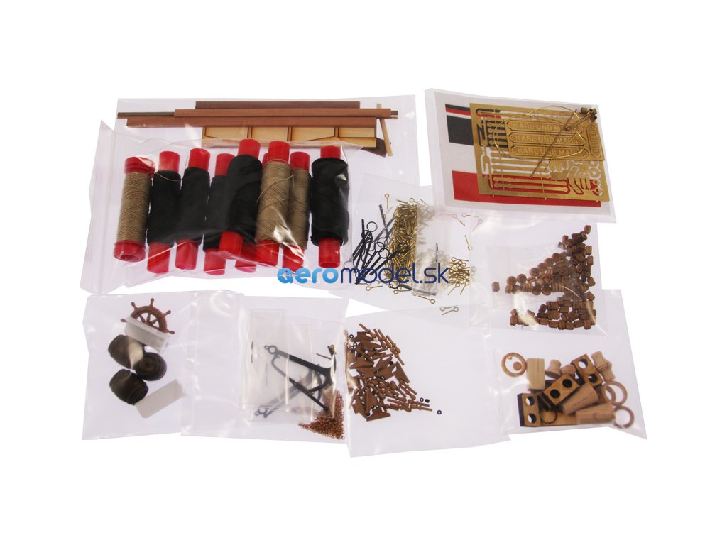 Balení obsahuje sadu překližkových dílů, sadu dřevěných lišt o různém průřezu, blistr s drobnými díly, díly z mosazi, sadu výkresů a český návod ke stavbě.
