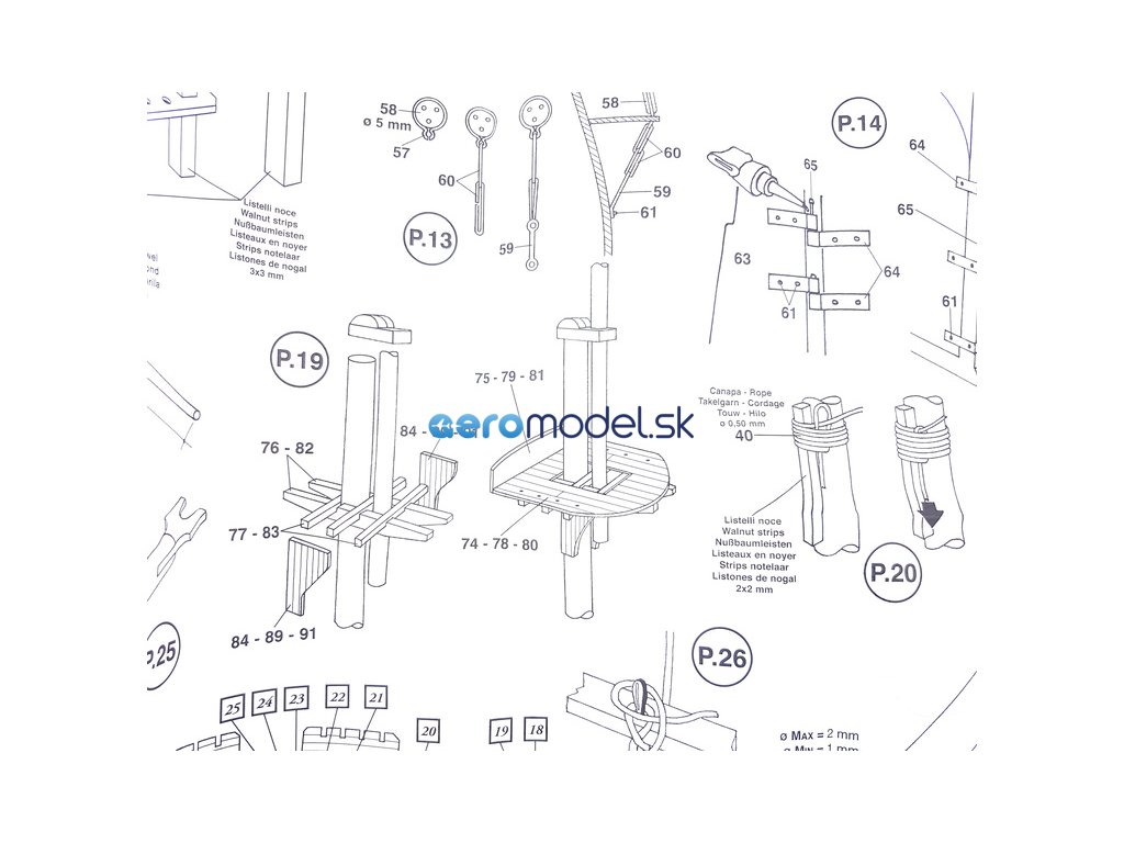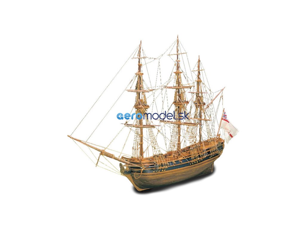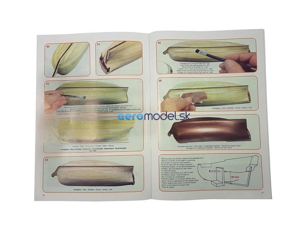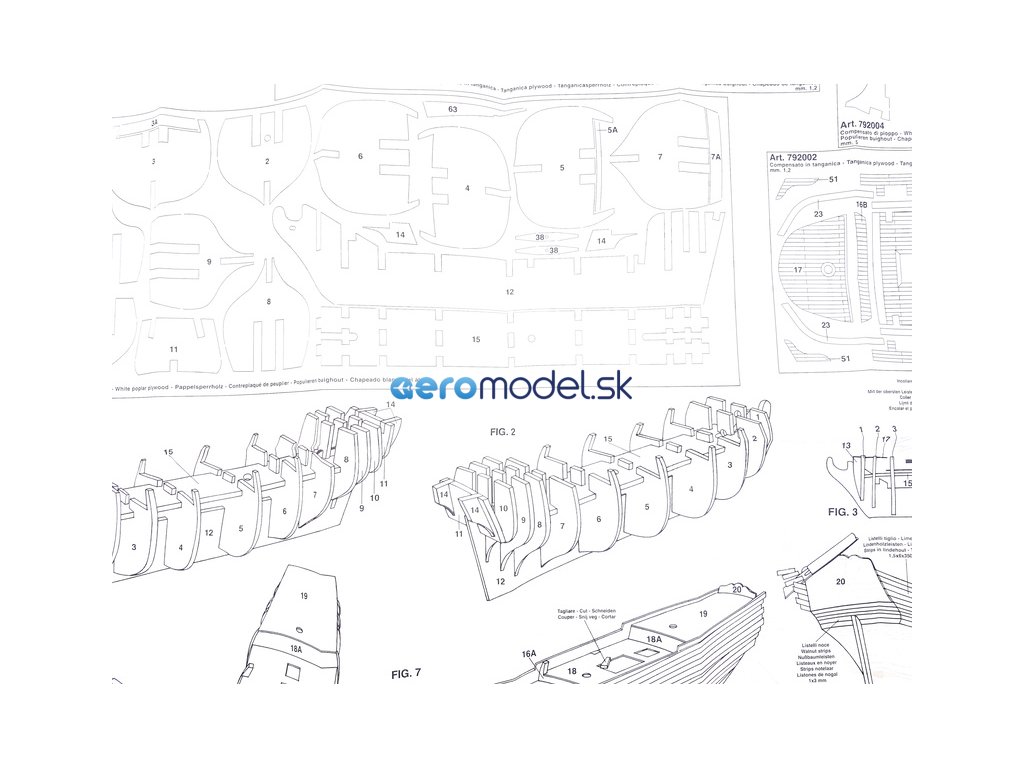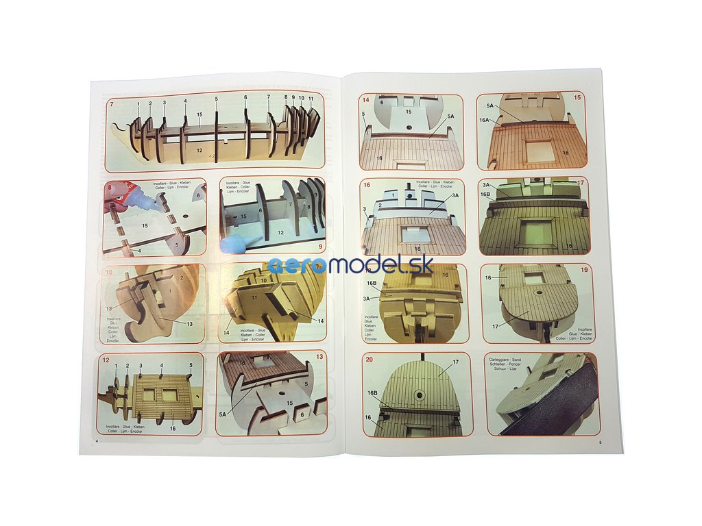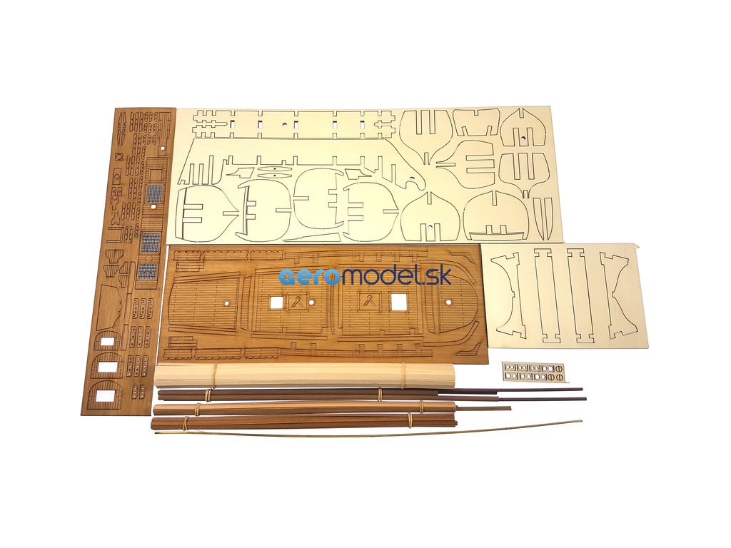 Balení obsahuje laserem řezané dřevěné díly, plaňky, stožáry, vlajku, lanoví a dekorace z mosazných odlitků. Stavební pokyny EN, DE, IT.