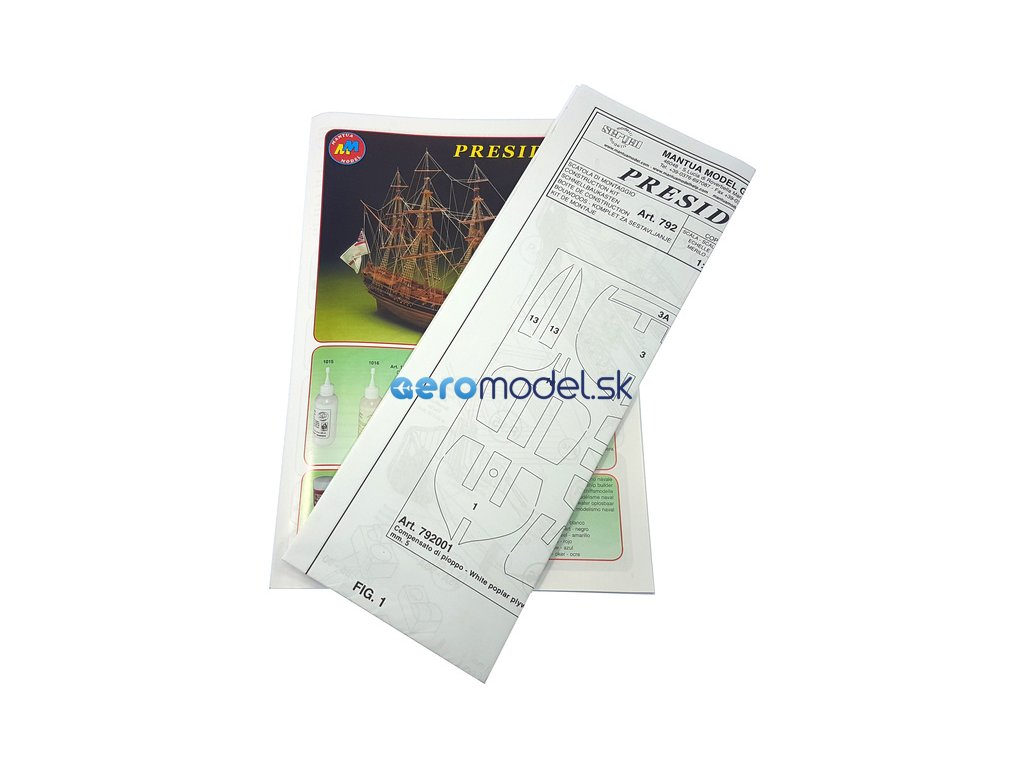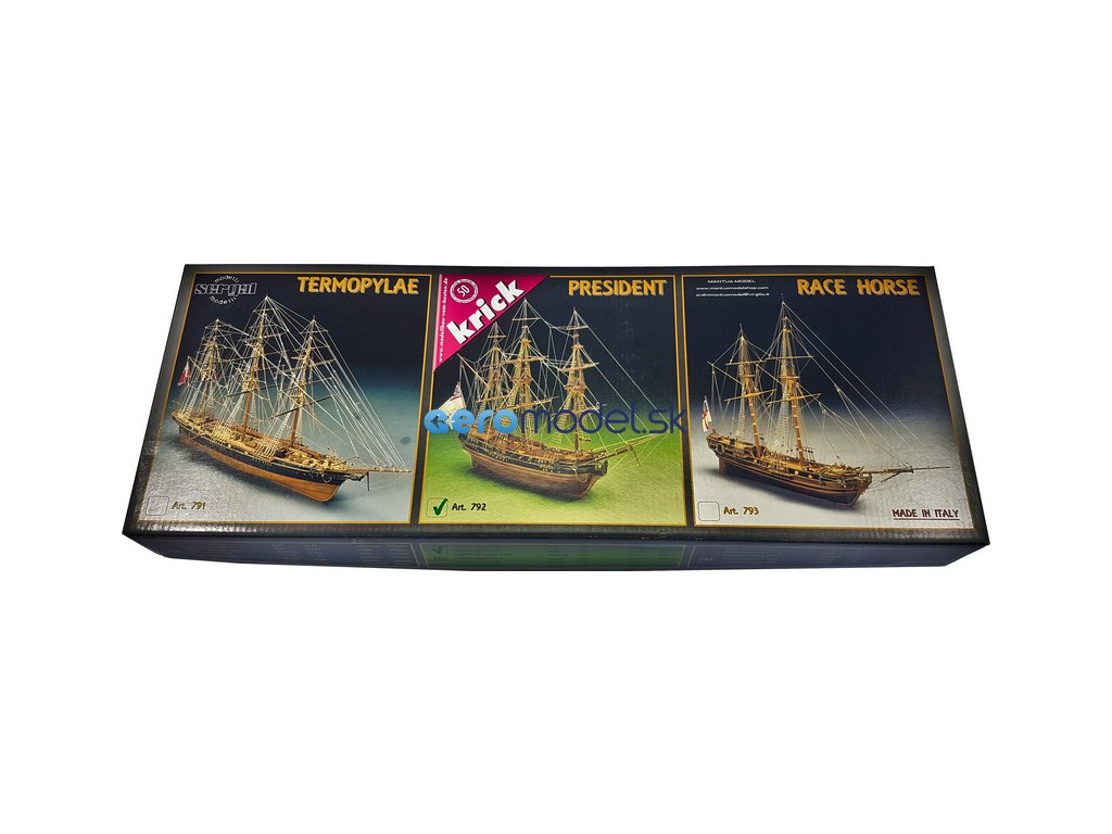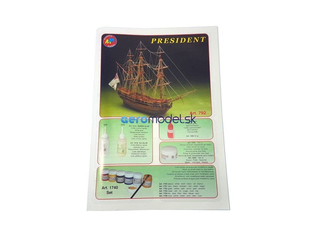 Stavebnice neplovoucího modelu lodi President v měřítku 1:60. Model anglické fregaty z 18. století, která byla velmi rychlá a dobře ovladatelná. Stavebnice obsahuje přesné laserem řezané dřevěné díly, dojité plaňkování a mosazné odlitky jako dekorace. Délka: 52cm. Model je koncipován bez plachet, aby vynikly jednotlivé detailu stěžňů. Jako příslušenství lze sadu plachet k modelu dokoupit.