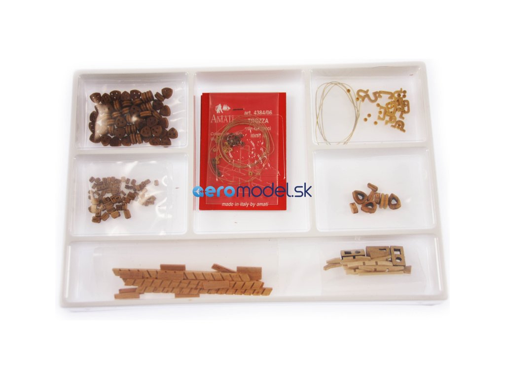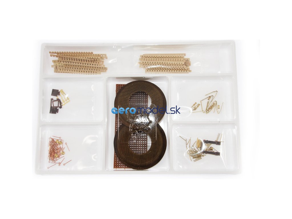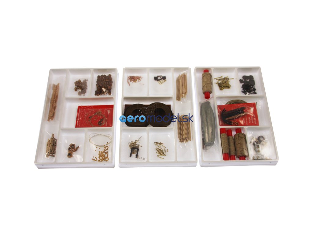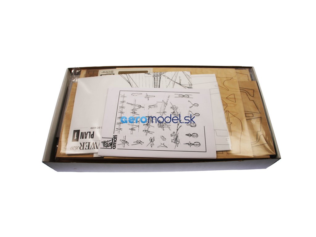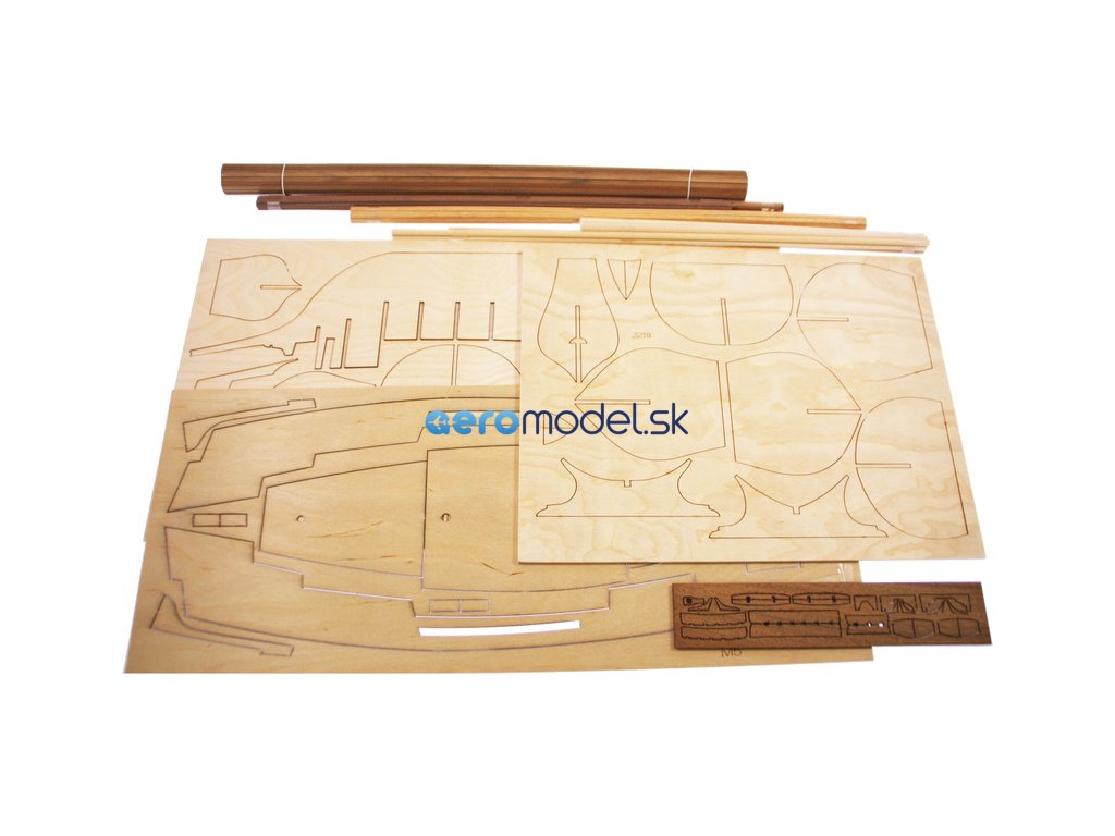 Po otevření víka krabice naleznete dřevěné díly modelu z překližky, sadu lišt, drobné součásti uzavřené v plastovém průhledném blistru, sadu výkresů a manuál.