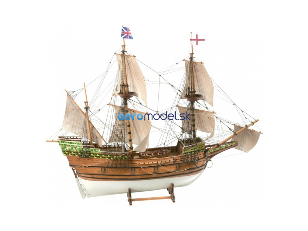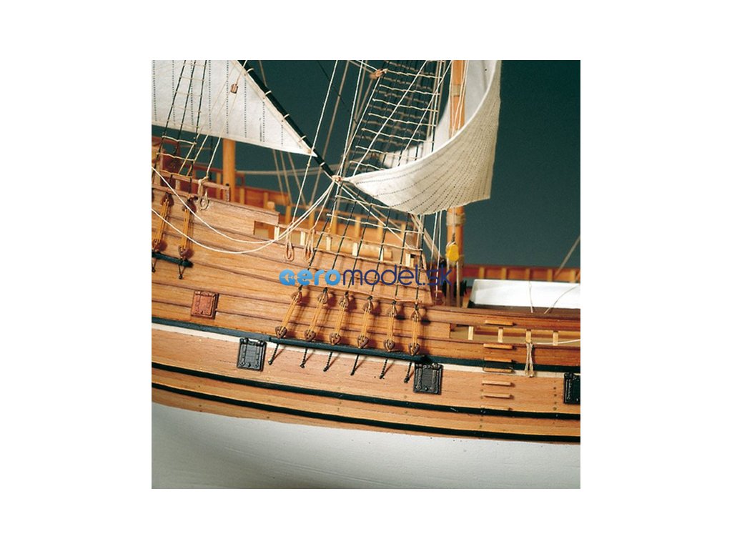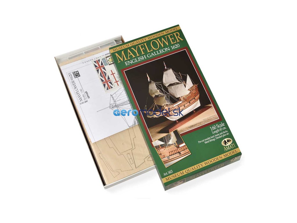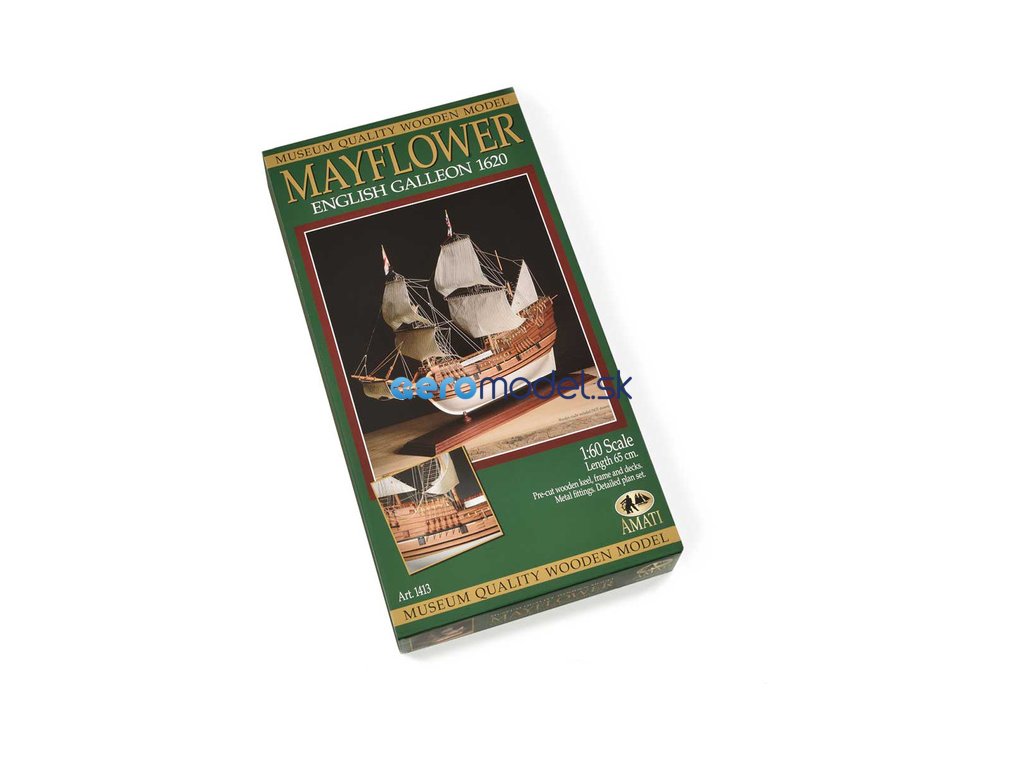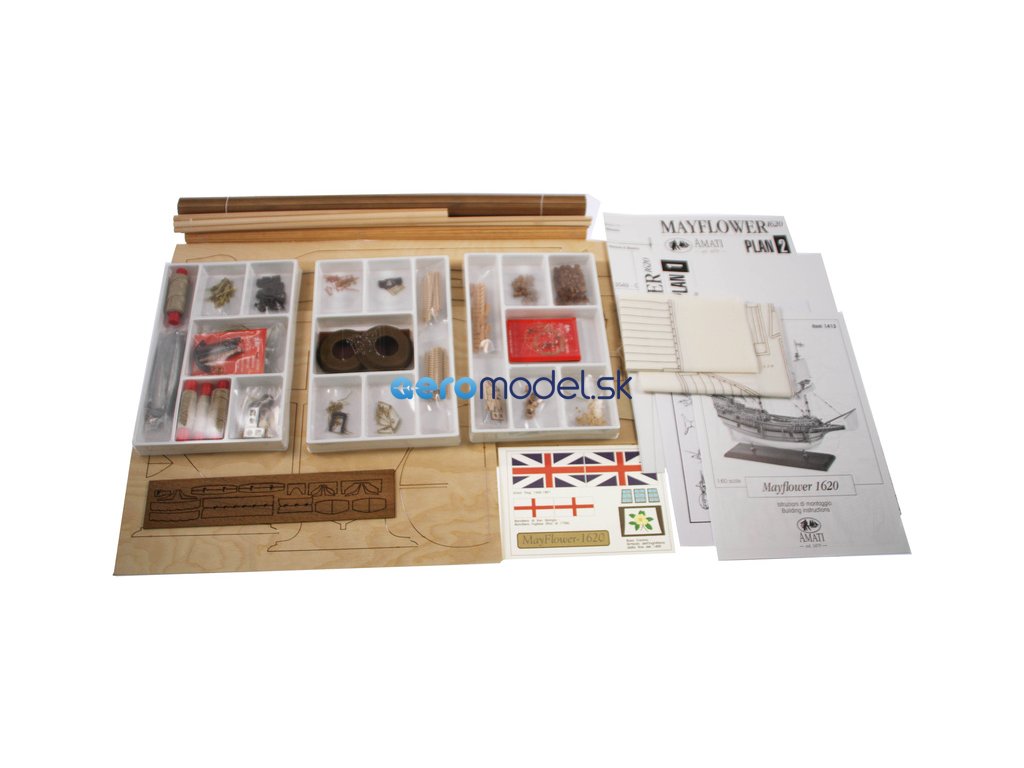 Stavebnice statické makety lodi, AMATI Mayflower anglická galeóna z roku 1620 v měřítku 1:60 kit. Mayflower byl znám otcům Pilgerväter, kdy přistál 6. září 1620 u Cape Cod. Tam Pilgerväter založili město Plymouth. Dřevěné díly jako kýl a obšívka jsou řezány laserem, obsahuje plachty, lanoví, stožáry, kování a plány.