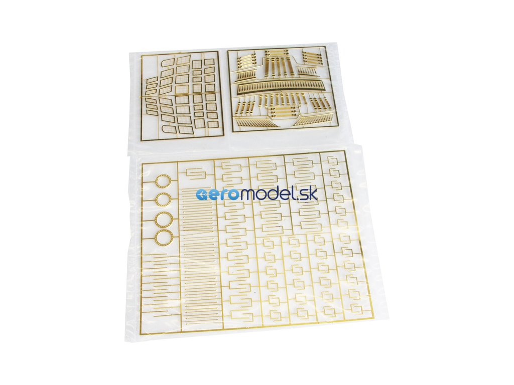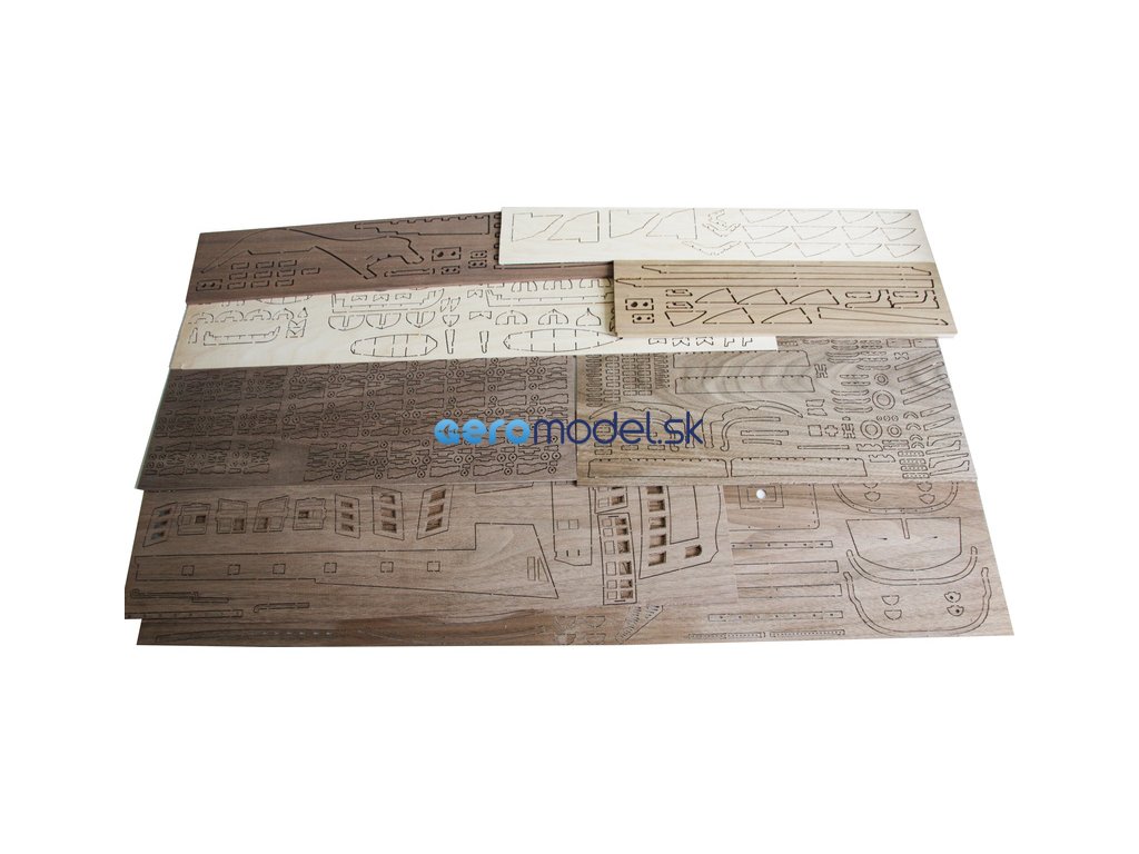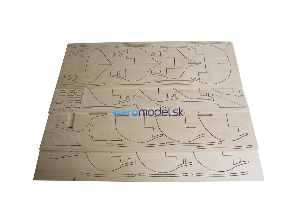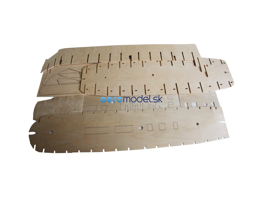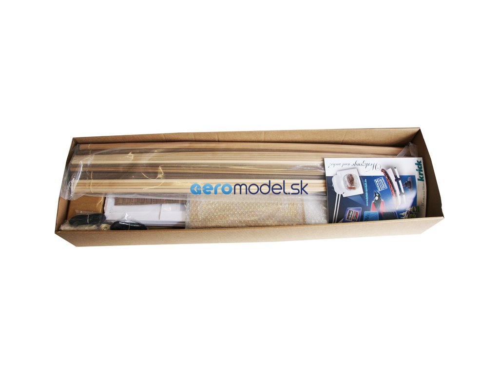 Po otevření víka krabice naleznete dřevěné díly modelu z překližky, sadu lišt, drobné součásti uzavřené v sáčcích, sadu výkresů a manuál.
