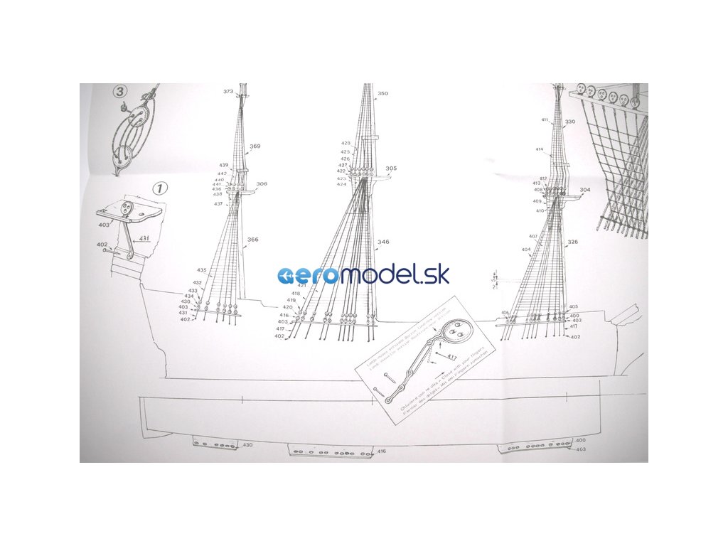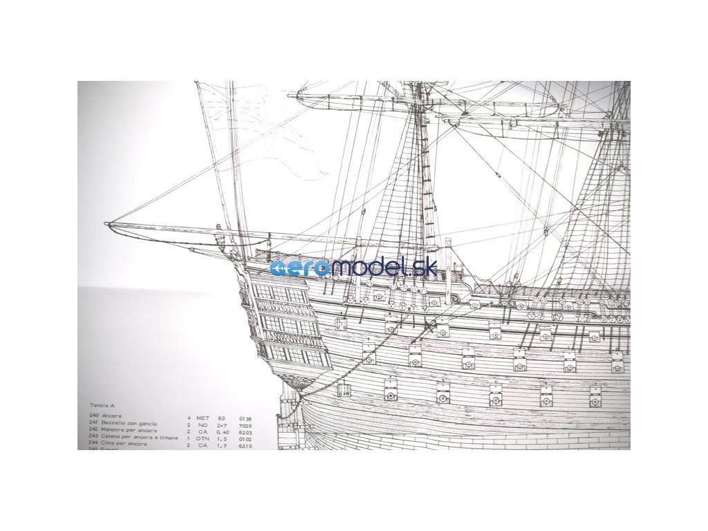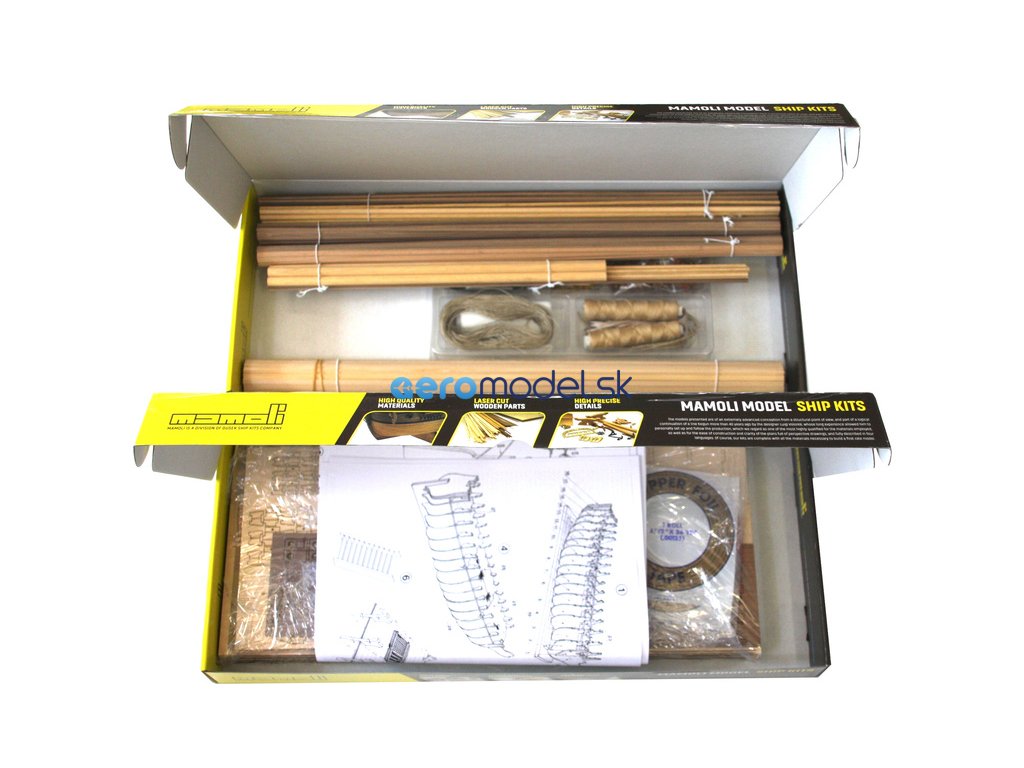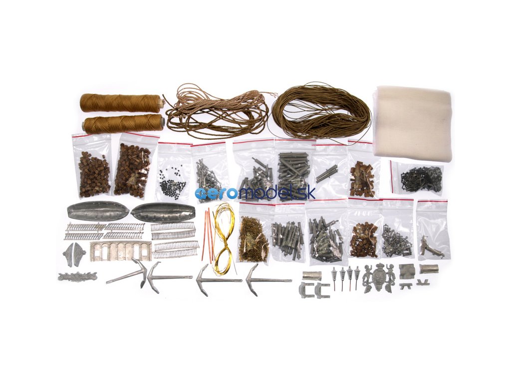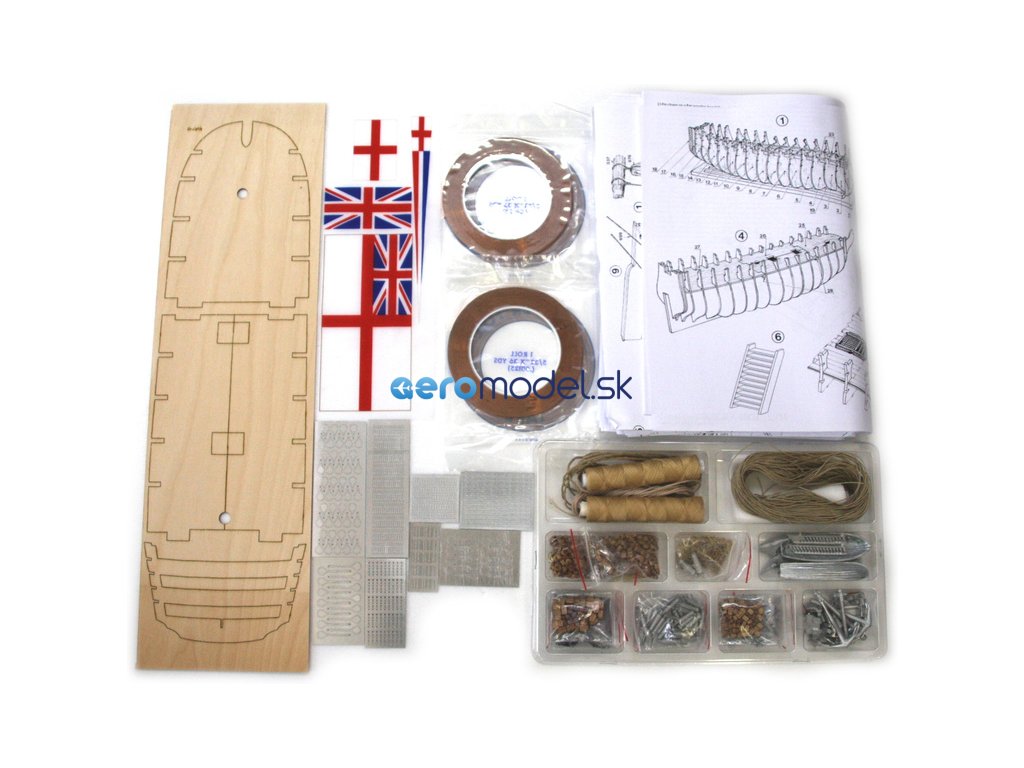 Balení obsahuje sadu překližkových dílů, dřevěných lišty, kovové odlitky, kovové destičky, lanoví, maketové doplňky, vlajky, sadu výkresů a manuál EN, DE, FR a IT.