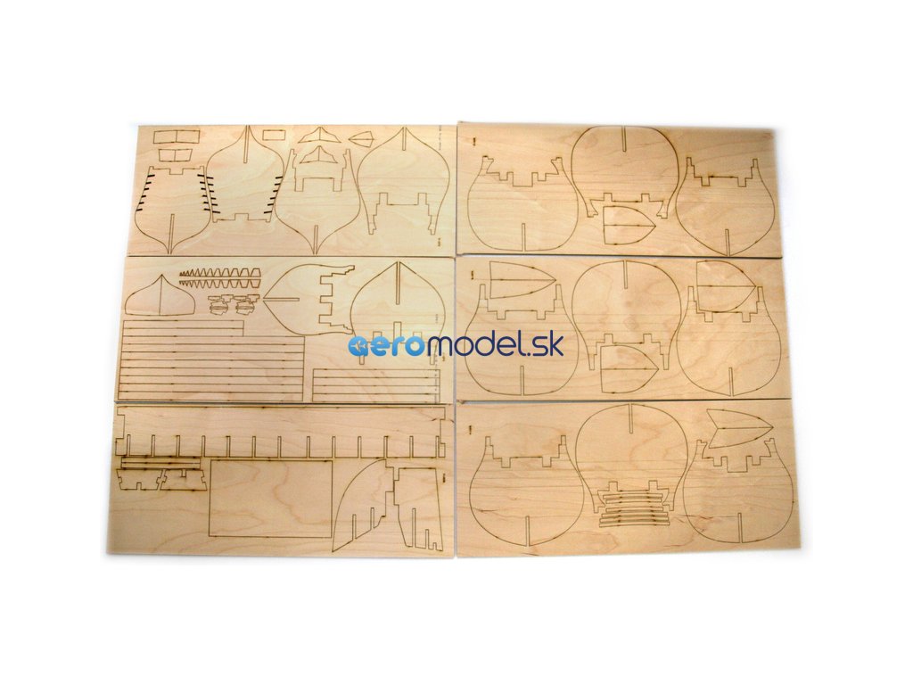 Po otevření víka krabice naleznete dřevěné díly modelu z překližky, sadu lišt, drobné součásti uzavřené v plastovém průhledném blistru, sadu výkresů a manuál.