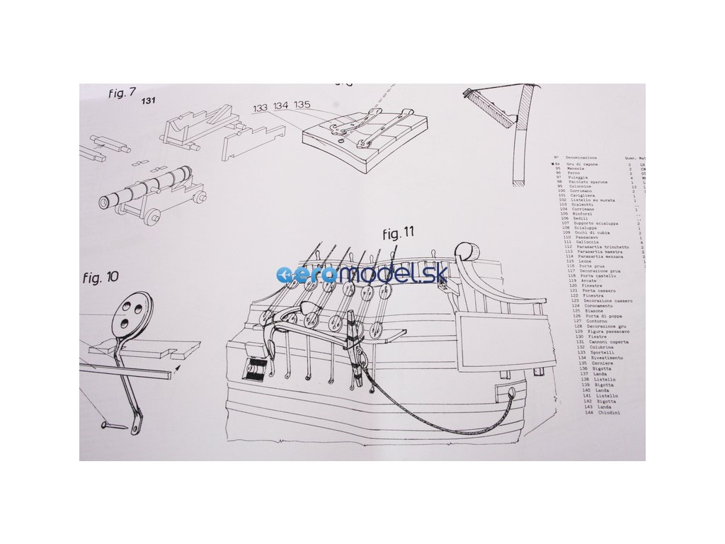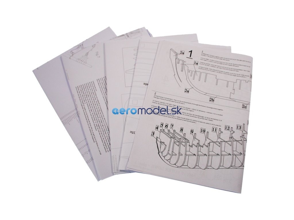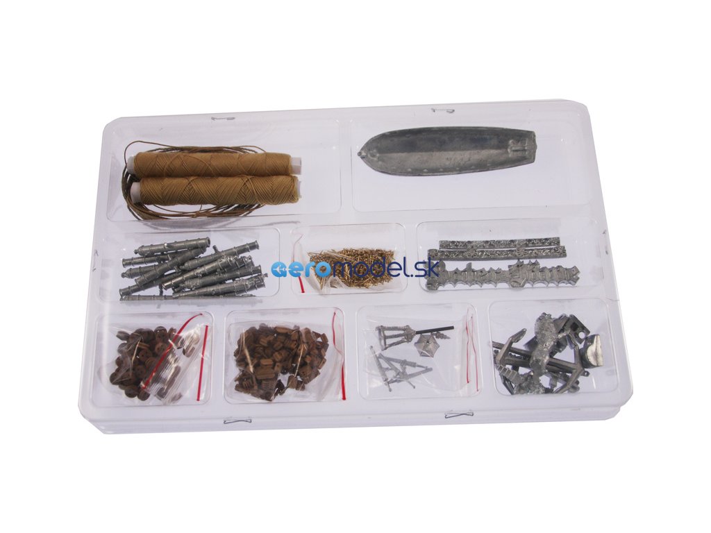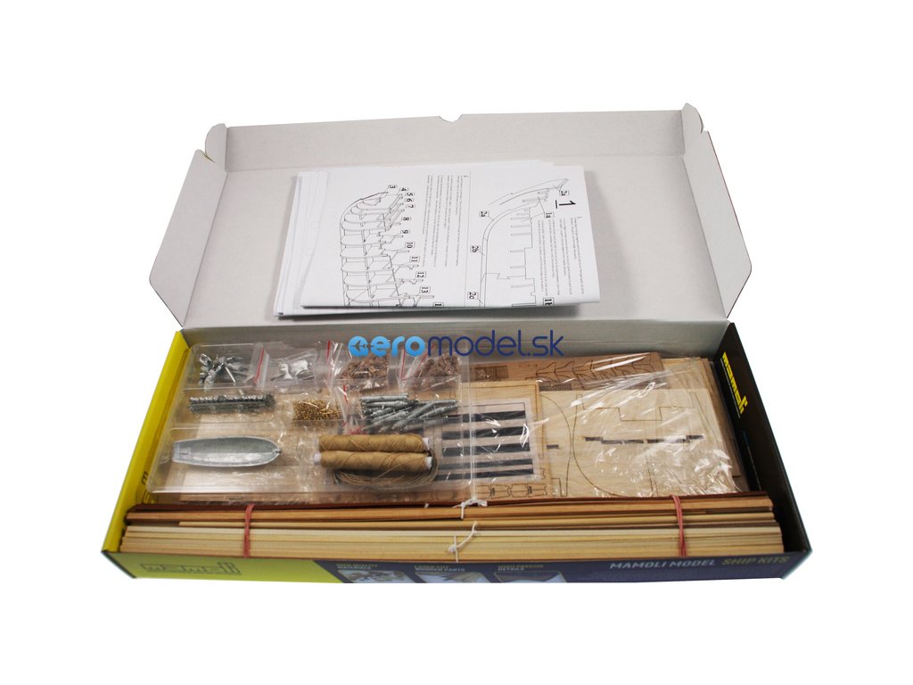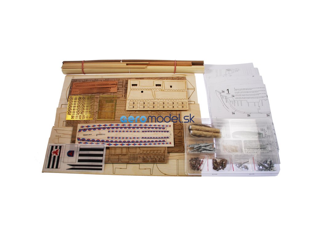 Balení obsahuje sadu překližkových dílů, sadu dřevěných lišt o různém průřezu, blistr s drobnými díly, mosazné lepty, vlajky, sadu výkresů a vícejazyčný manuál.