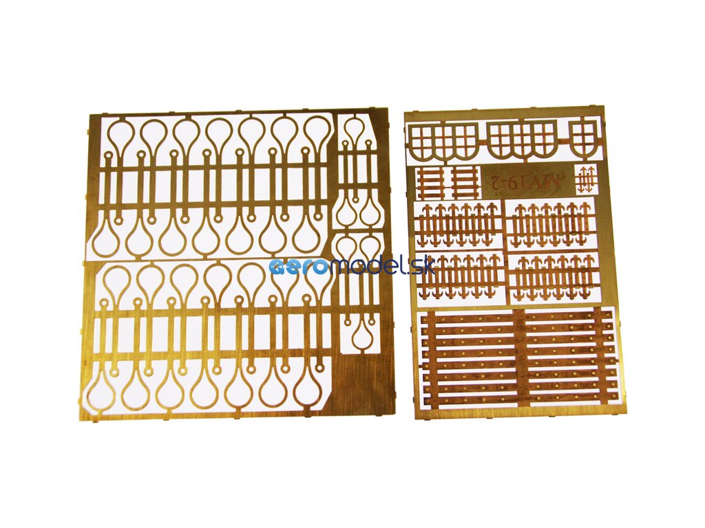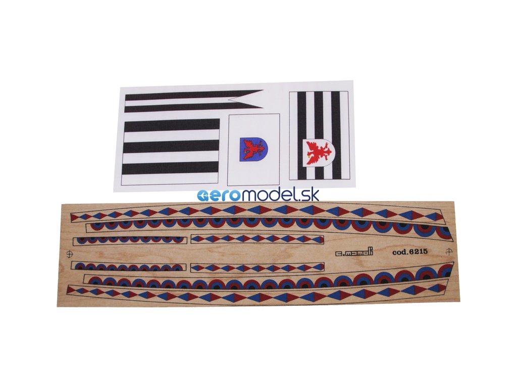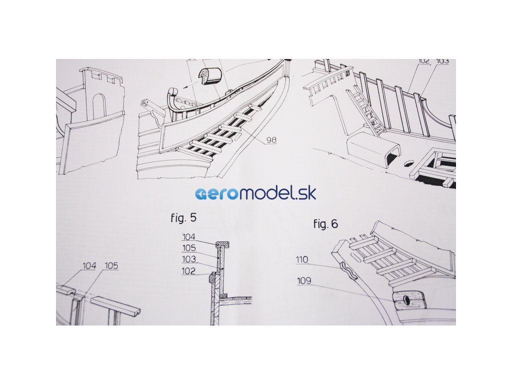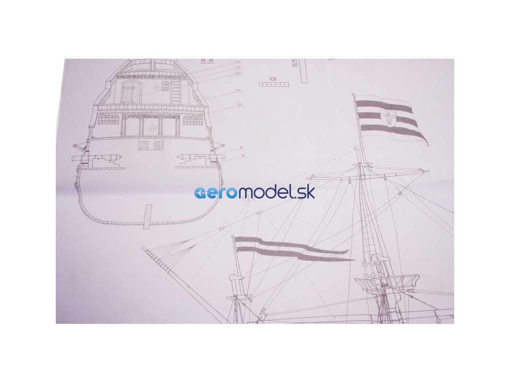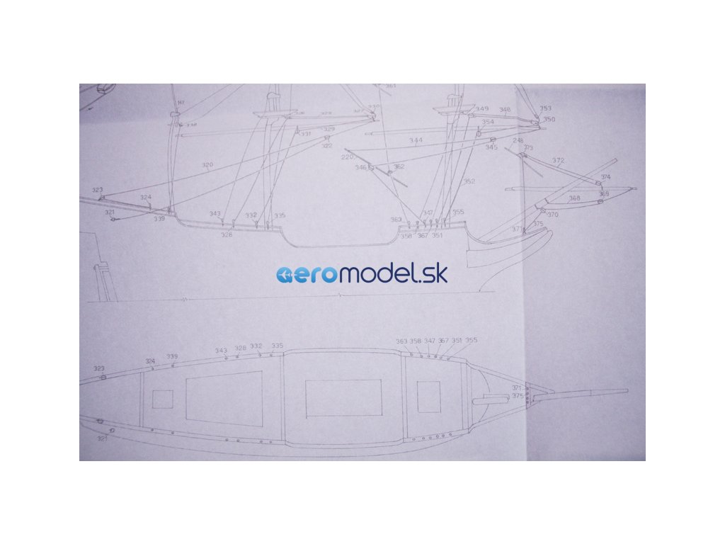 Balení obsahuje sadu překližkových dílů, sadu dřevěných lišt o různém průřezu, blistr s drobnými díly, mosazné lepty, vlajky, sadu výkresů a vícejazyčný manuál.