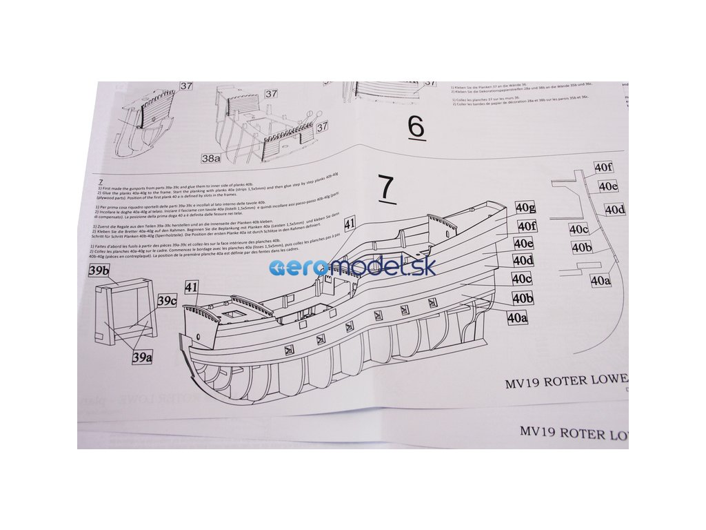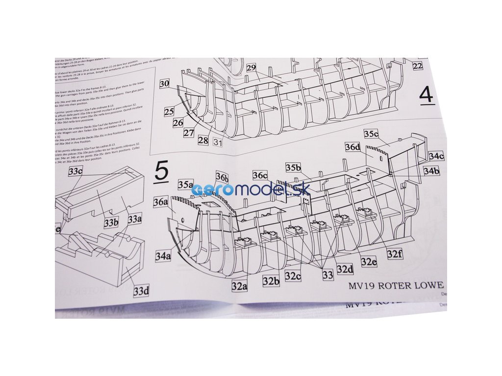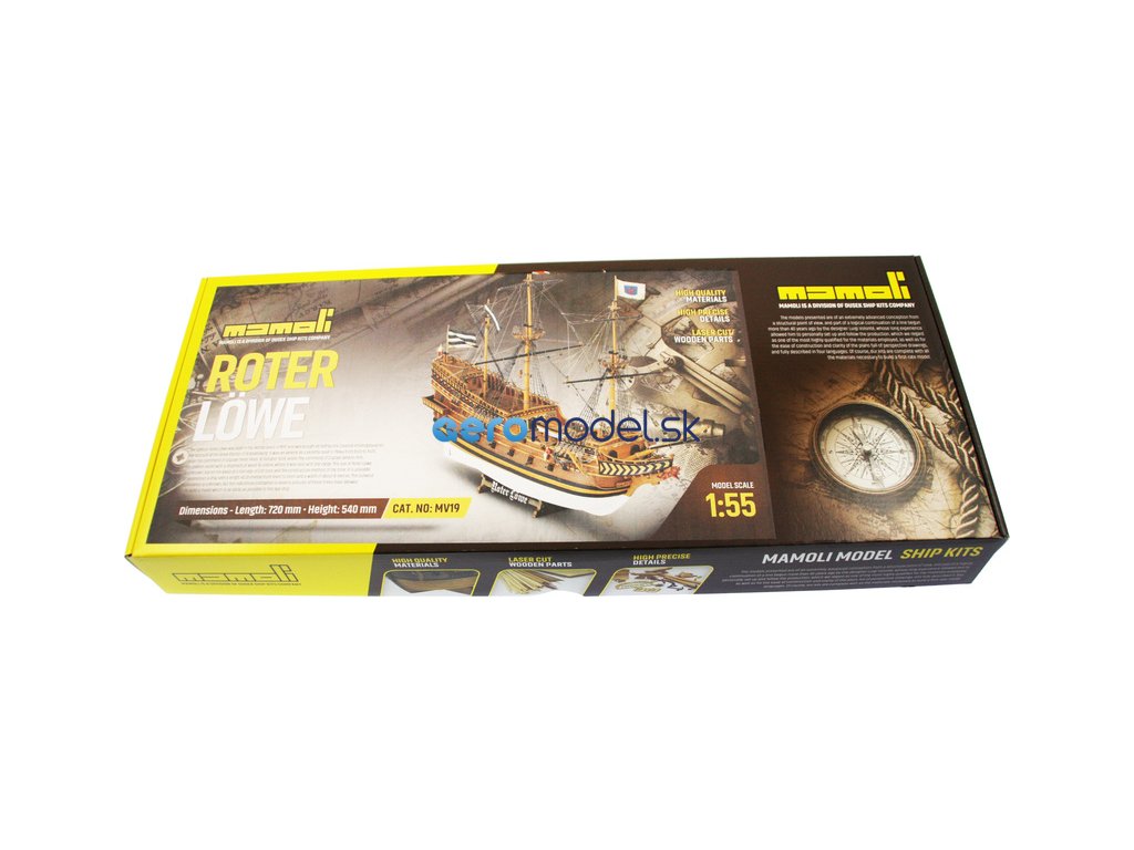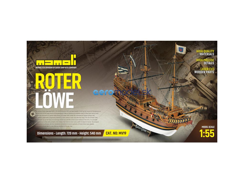 Stavebnice neplovoucího historického modelu plachetní lodi MAMOLI Roter Löwe z roku 1597, je v měřítku 1:55 a má celkovou délku 720mm. Galeona Roter Löwe byla postavena v Holandsku jako obchodní loď a pro radu města Königsberg v Brandenbursku byla zakoupena v roce 1561pro obranu přístavu. V balení jsou dřevěné díly, lišty a množství kování, lanoví, plány atd.