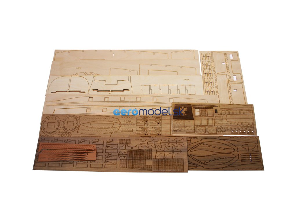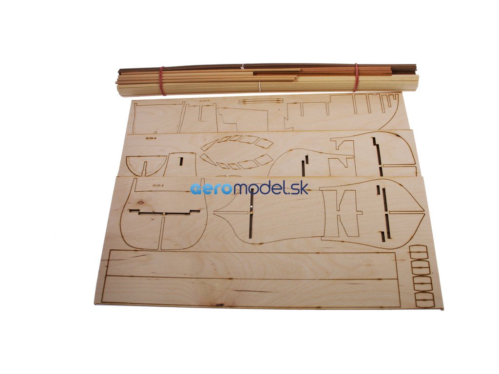 Po otevření víka krabice naleznete dřevěné díly modelu z překližky, sadu lišt, drobné součásti uzavřené v plastovém průhledném blistru, sadu výkresů a manuál.