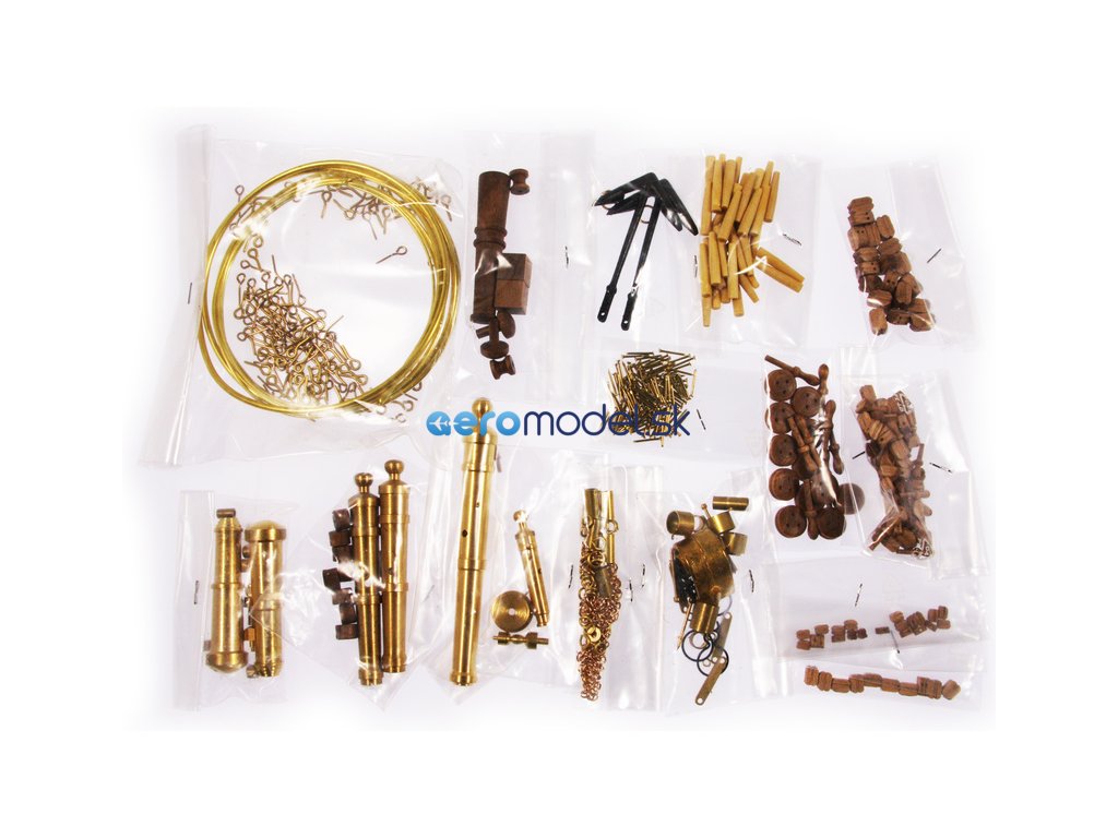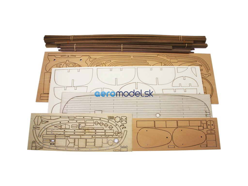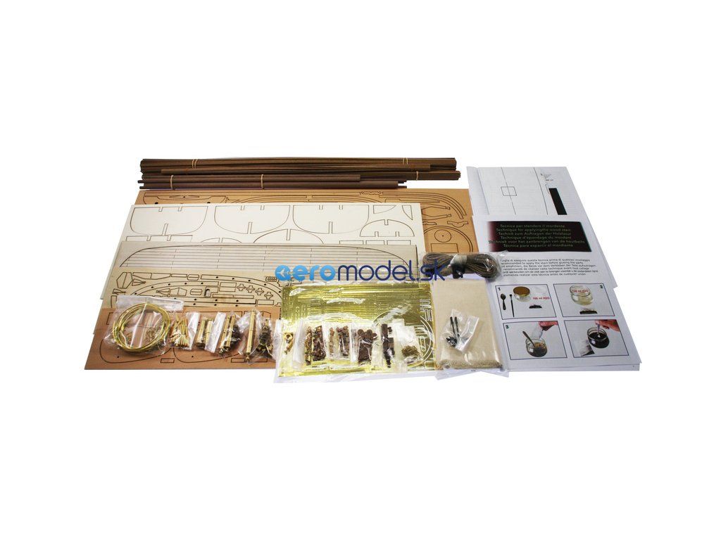 Balení obsahuje laserem řezané dřevěné díly, plaňky, stožáry, plachtovinu, lanoví, kovové a dřevěné kování, kovové odlitky a dekorace vyleptané z mosazi. Stavební plán.