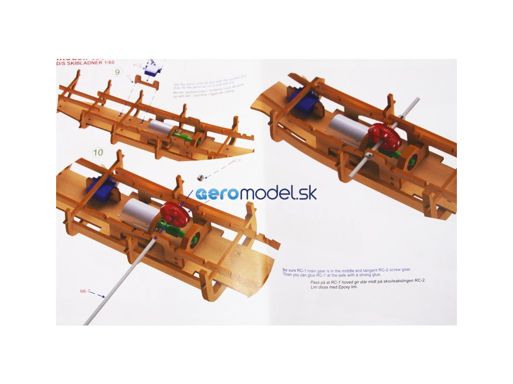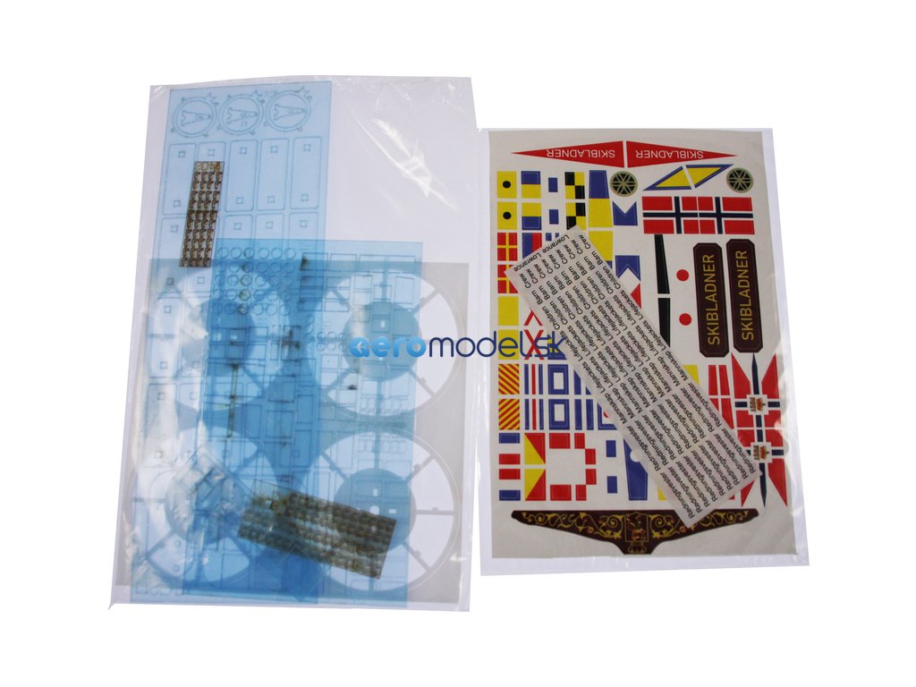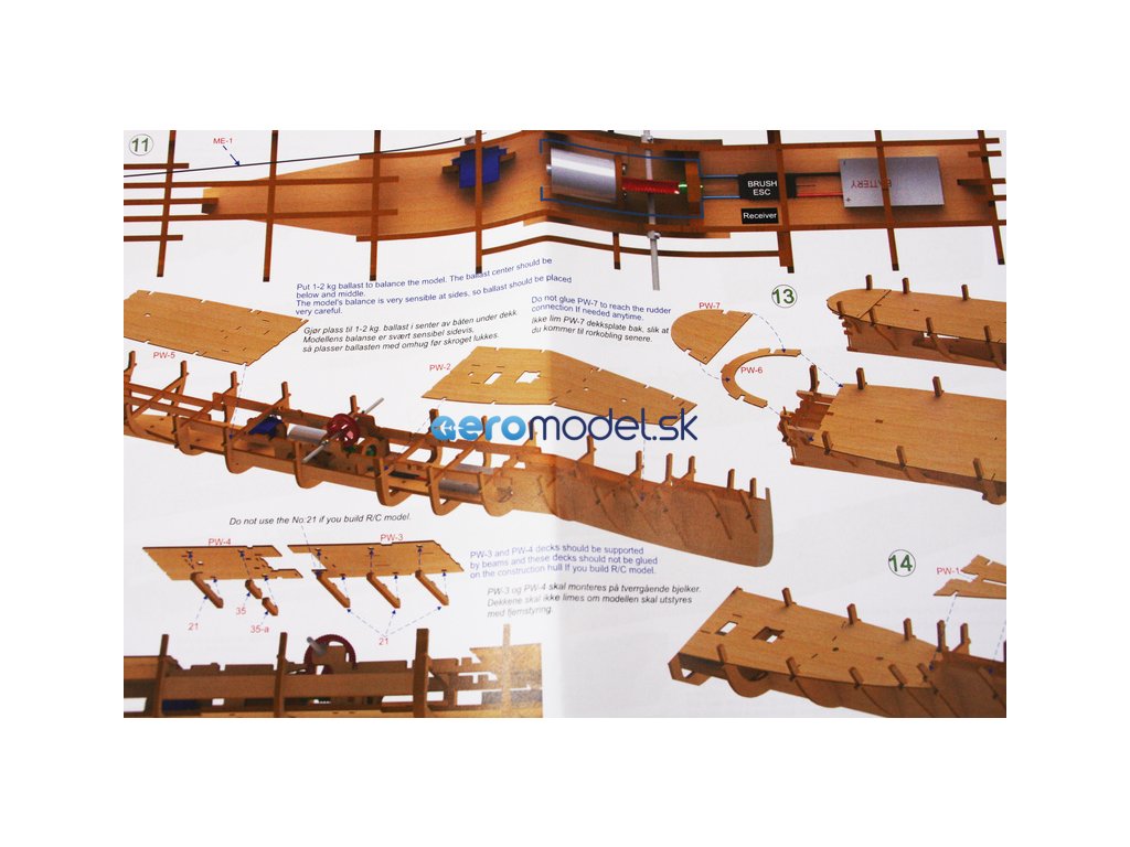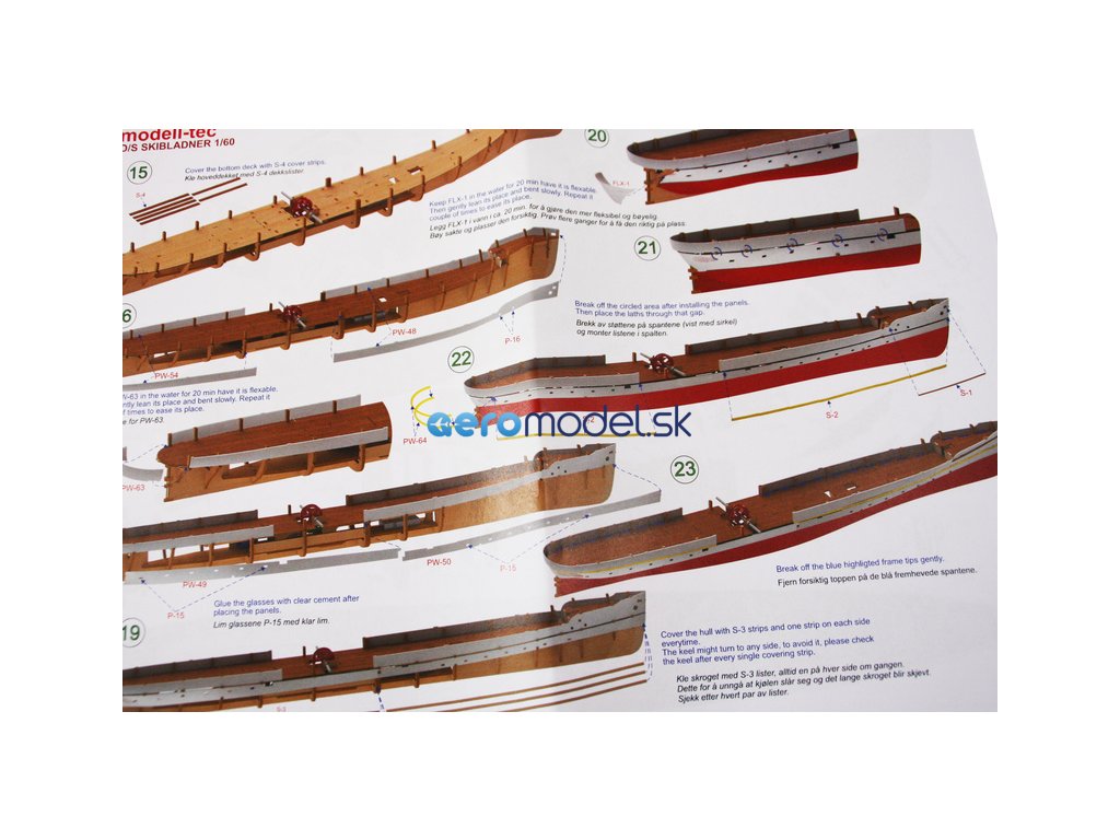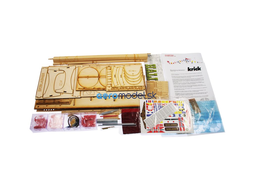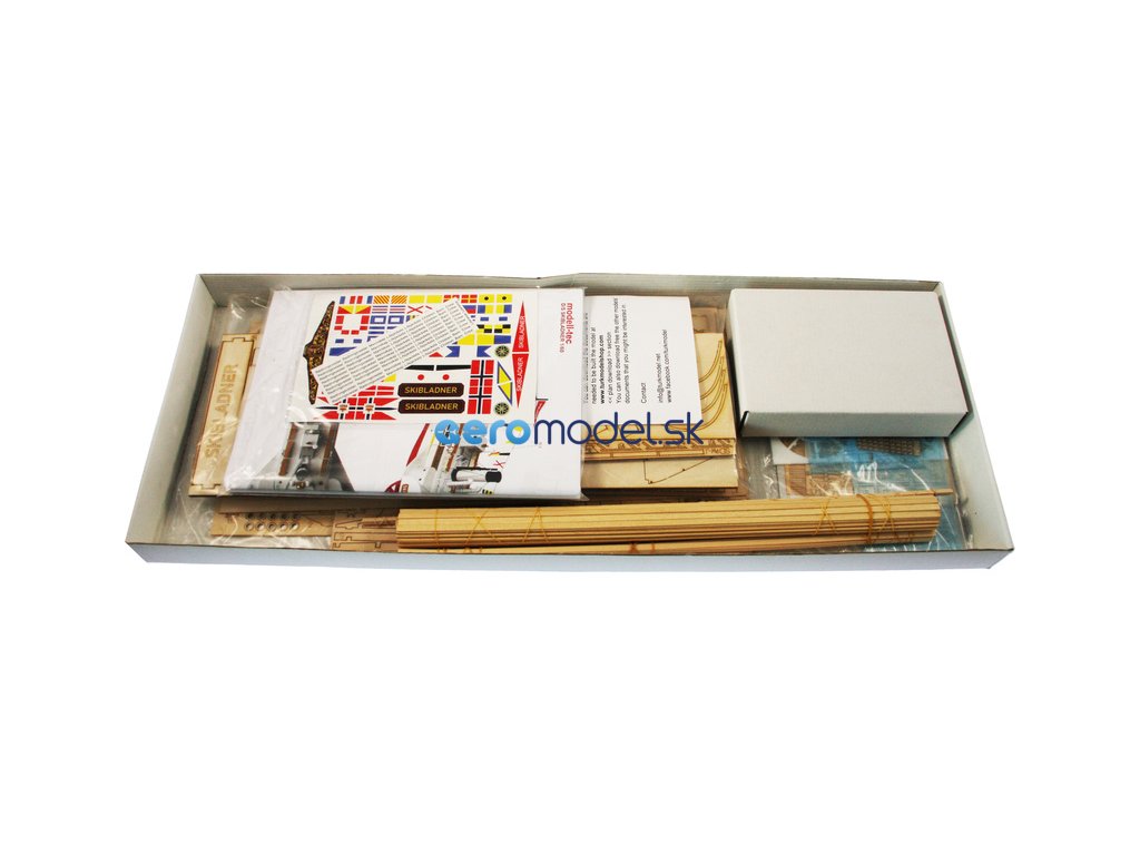 Balení obsahuje sadu překližkových dílů, sadu dřevěných lišt o různém průřezu, blistr s drobnými díly, díly z mosazi, sadu výkresů, pokyny k provozu a vícejazyčný manuál.