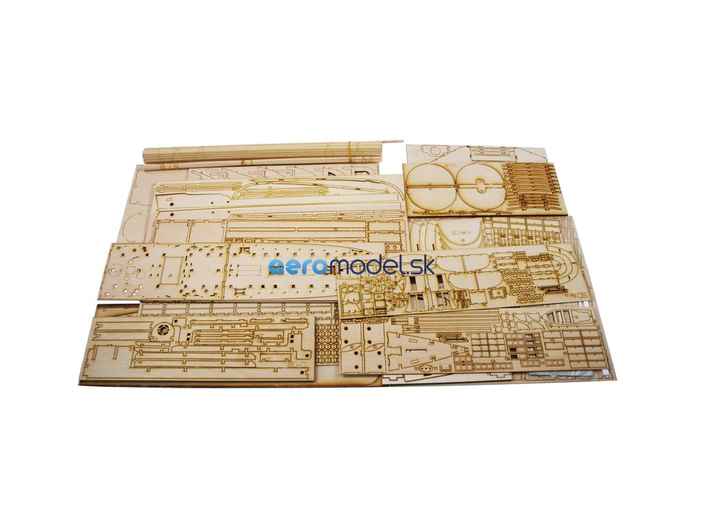 Po otevření víka krabice naleznete dřevěné díly modelu z překližky, sadu lišt, drobné součásti uzavřené v plastovém průhledném blistru, sadu výkresů a manuál.