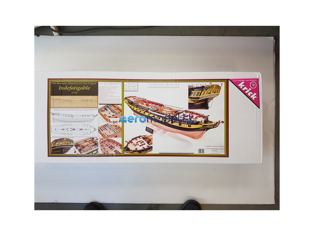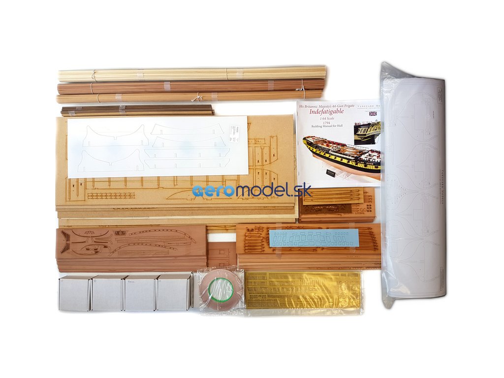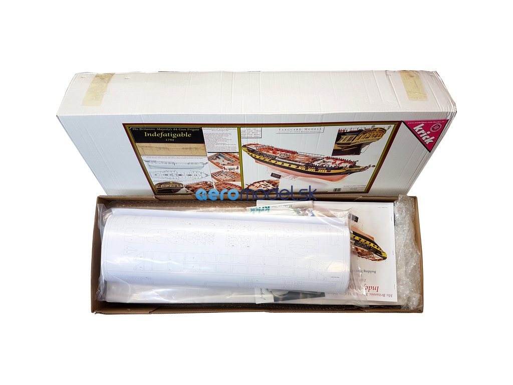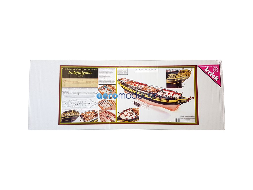 Stavebnice neplovoucí makety lodi od anguard Models, HMS Indefatigable z roku 1794, v měřítku 1:64. Pro zkušené modeláře. Dřevěný trup z laserem vyřezaných dílů, součástí je stavební plán, autentické detaily. Komplexní, barevný návod k použití