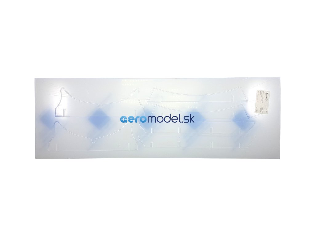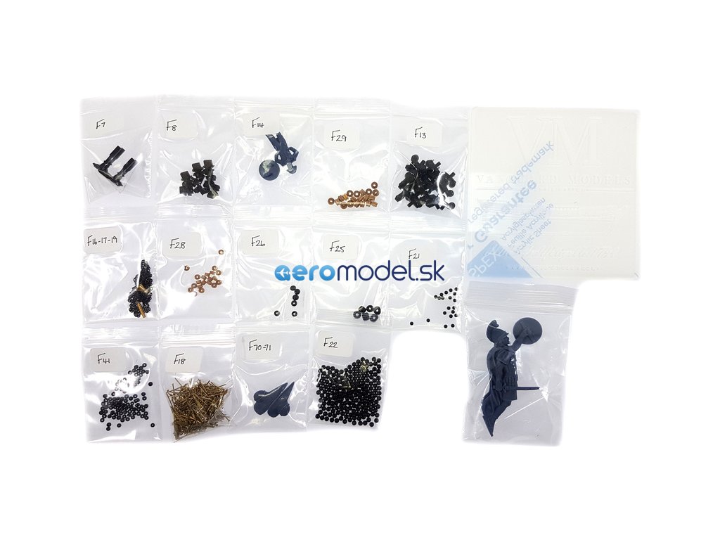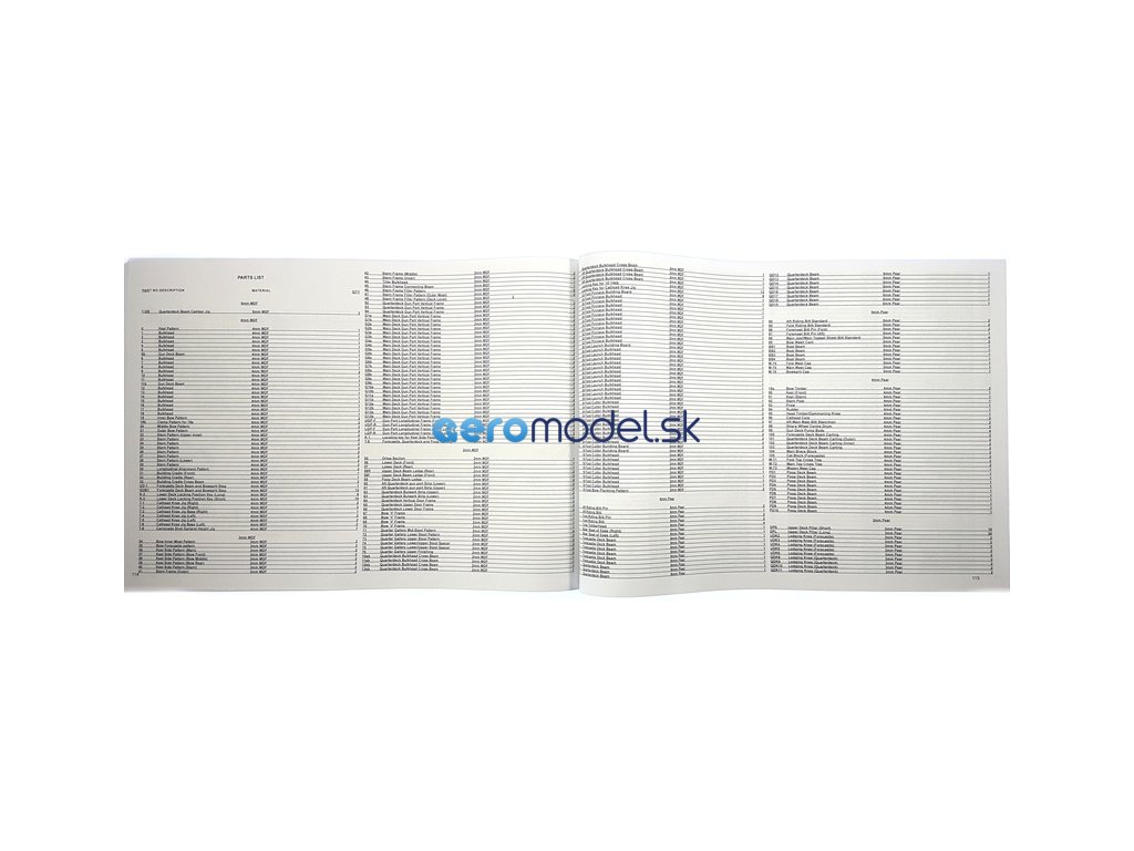 Po otevření víka krabice naleznete dřevěné díly modelu z překližky, lišty, drobné součásti uzavřené v sáčcích, mosazné lepty, díly z resinu, sadu výkresů a manuál.