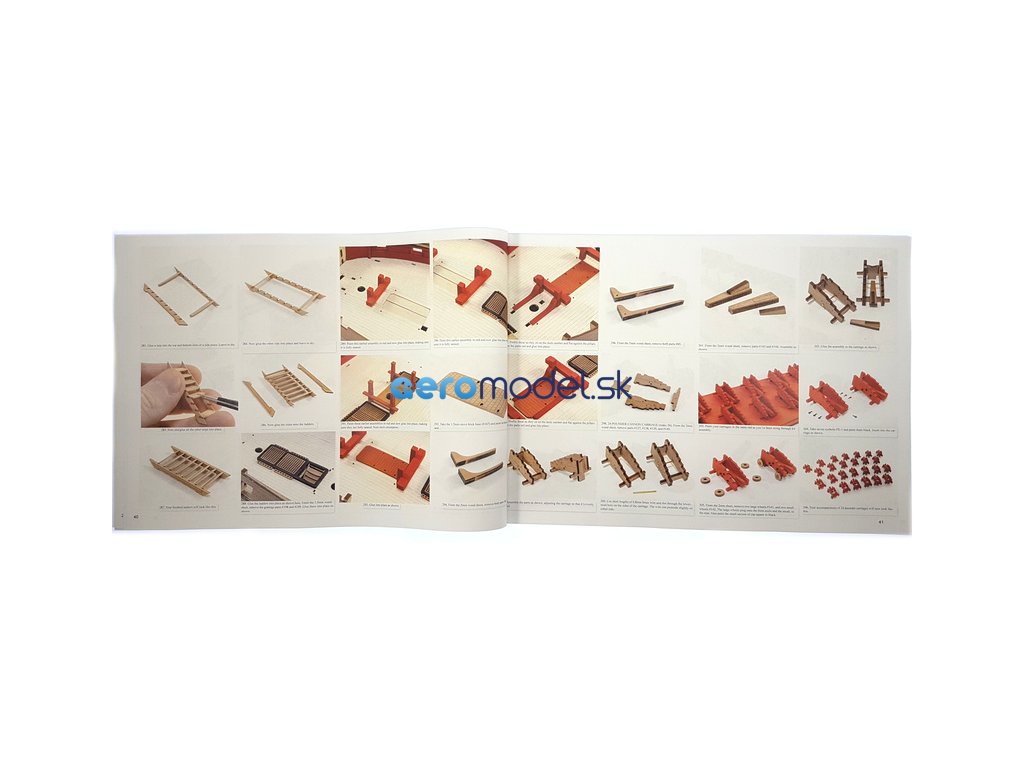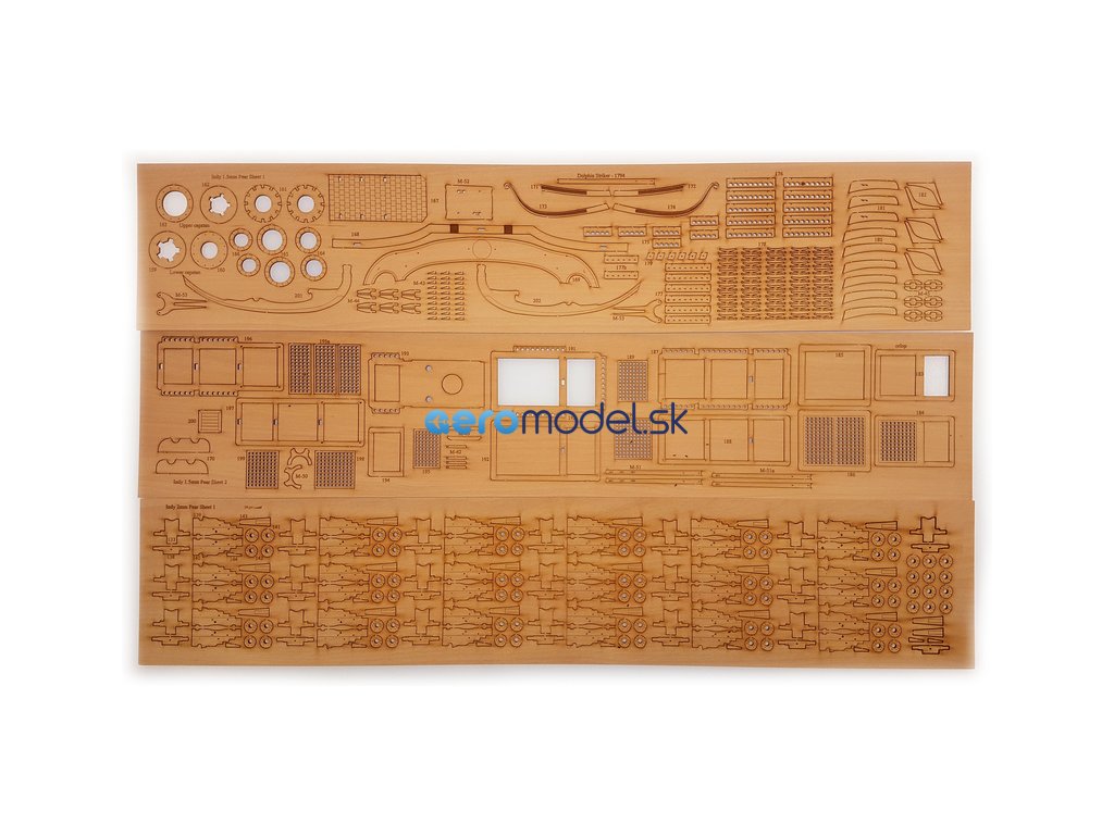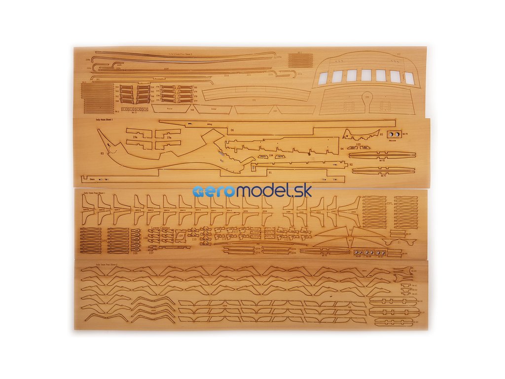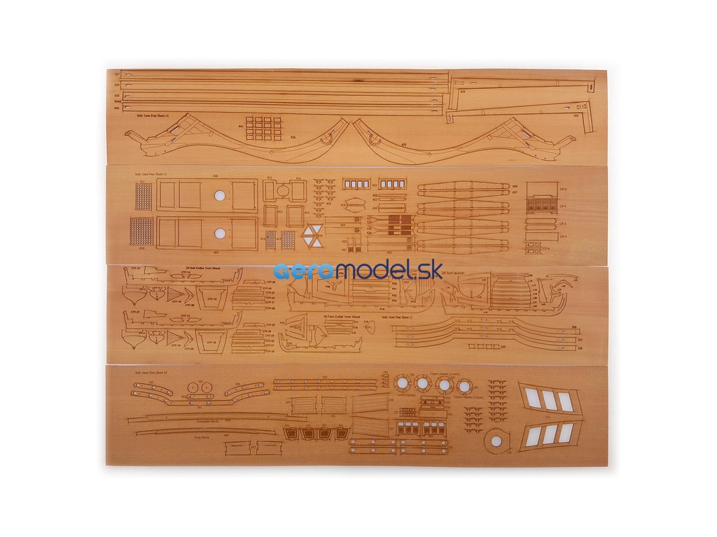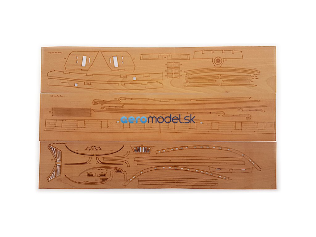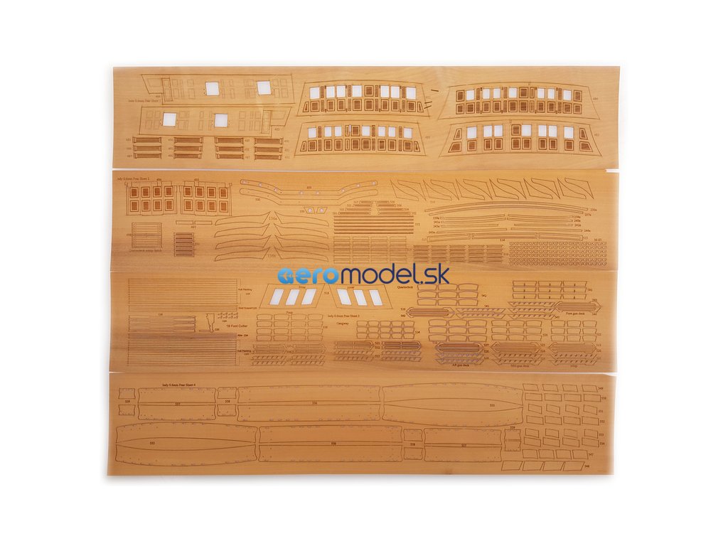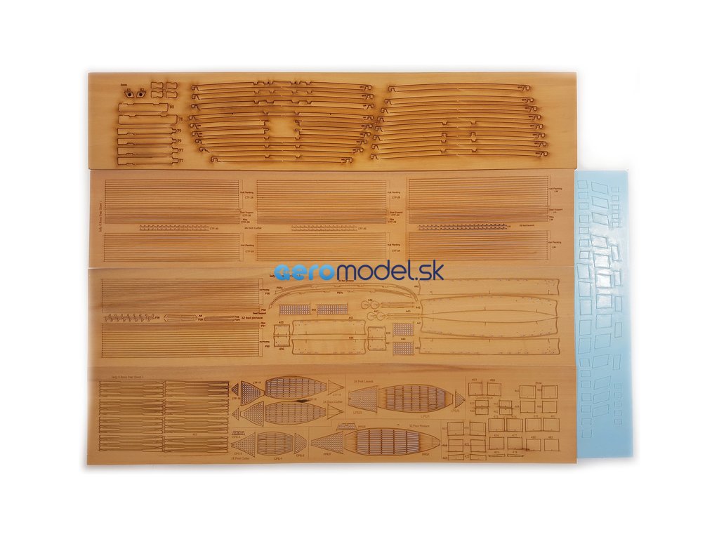 Balení obsahuje laserem řezané díly z překližky, plaňky, mosazné pláty z detaily, lana, plastové díly jako jsou děla židle a kotel. Podrobný obrázkový návod krok po kroku. Stavební plánky 1:1.