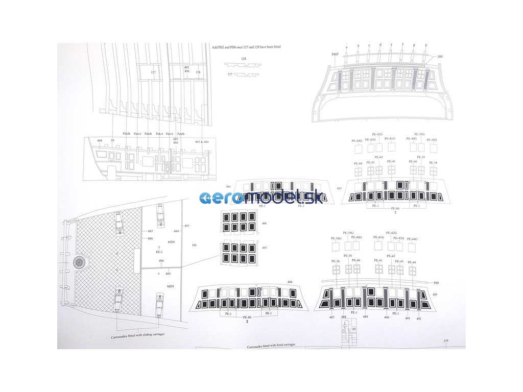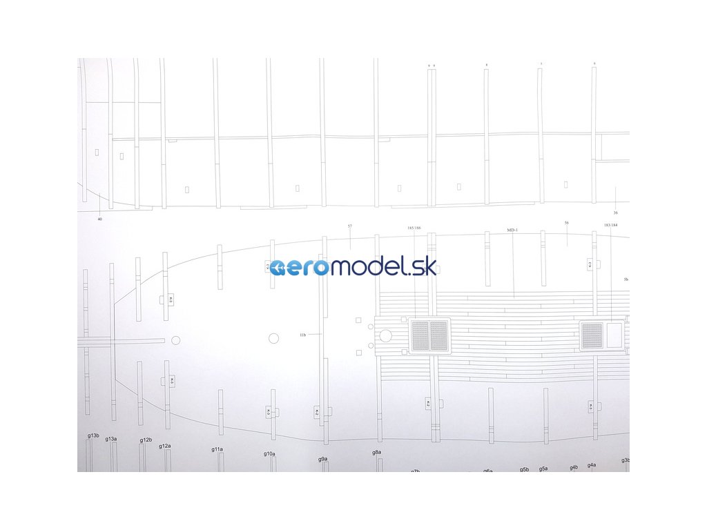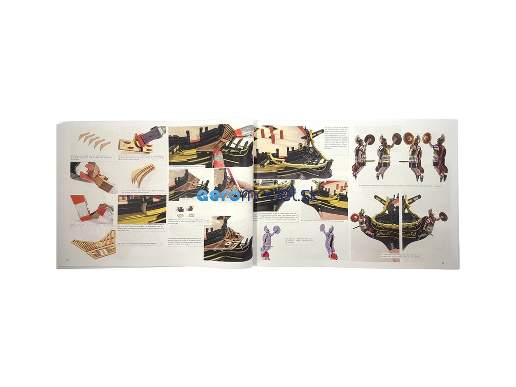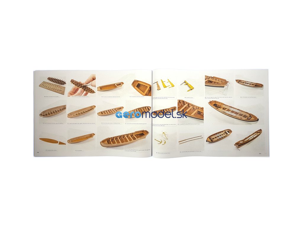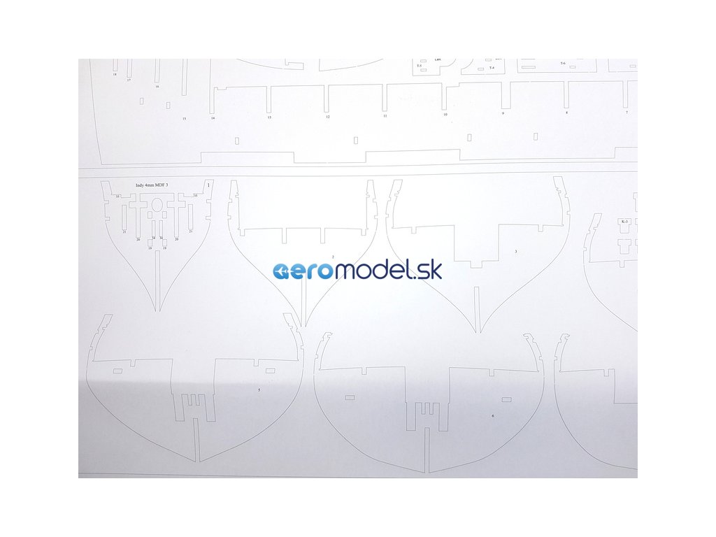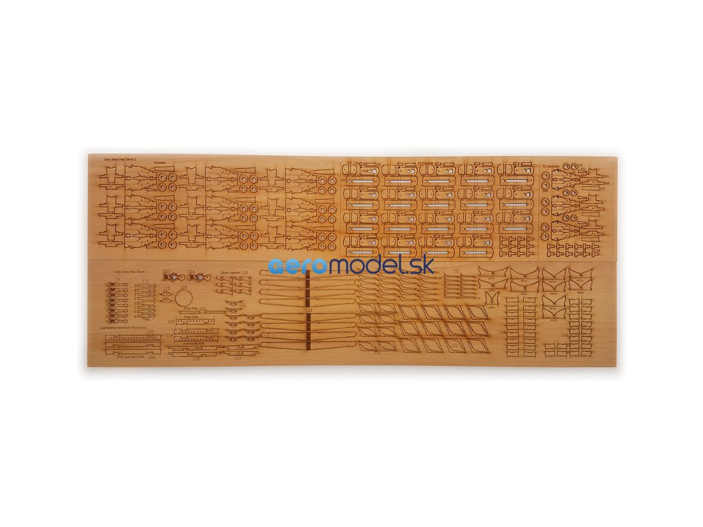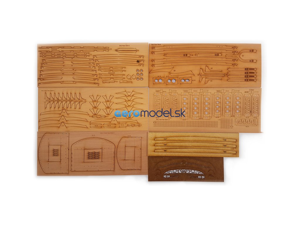 Balení obsahuje laserem řezané díly z překližky, plaňky, mosazné pláty z detaily, lana, plastové díly jako jsou děla židle a kotel. Podrobný obrázkový návod krok po kroku. Stavební plánky 1:1.