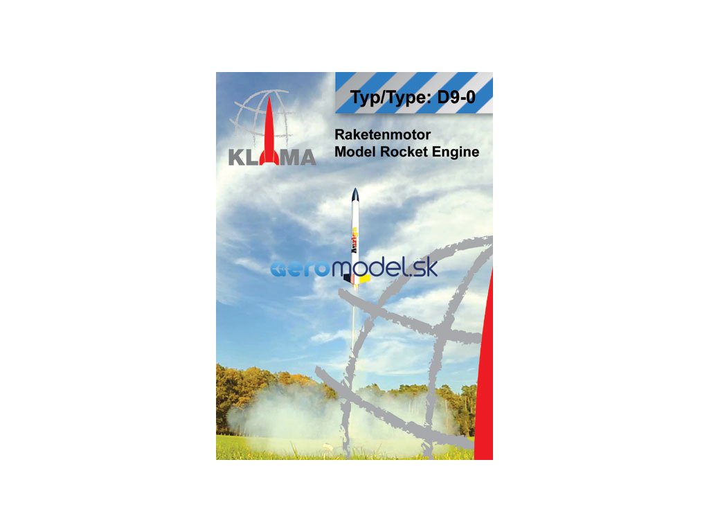 Raketový motor Klima D9-0 pre modely rakiet. Rozmery raketového motora ø18 x 70 mm, impulz 20 N-s, priemerný ťah E2 N, čas horenia 2,1 s, oneskorenie katapultáže 0 s. Hmotnosť motora 26,3 g, hmotnosť náplne 15,5 g. Maximálna odporúčaná hmotnosť modelu rakety je 300 g.