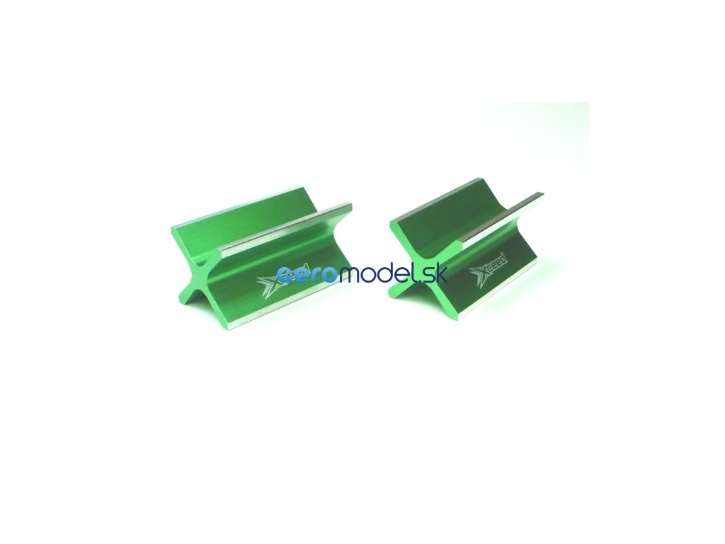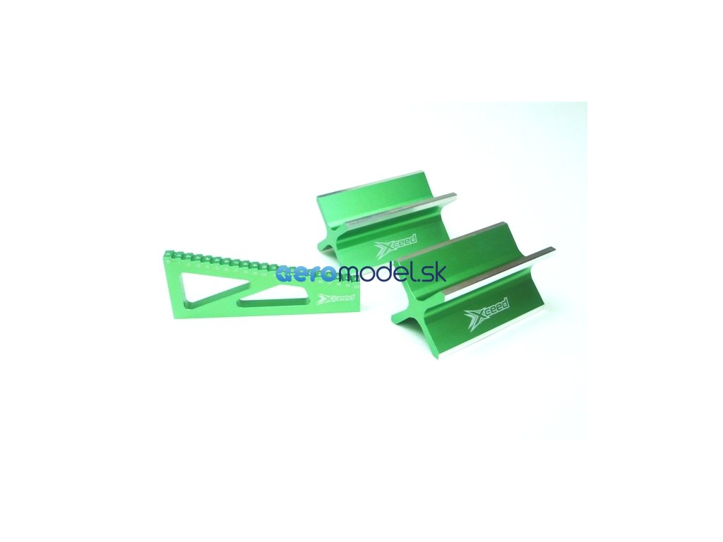 Silné a odolné hliníkové nastavovací bloky pro použití s 1/8 Off ROad podvozky. Tyto bloky udrží váší Buggy nebo Truggy v dobré pozici při seřizovacích pracích na vašem stole. Jsou vysoké 40 mm a široké 80 mm ve tvaru Xceed X. Zelený eloxovaný hliník s vyrytými logy Xceed.