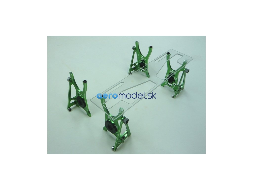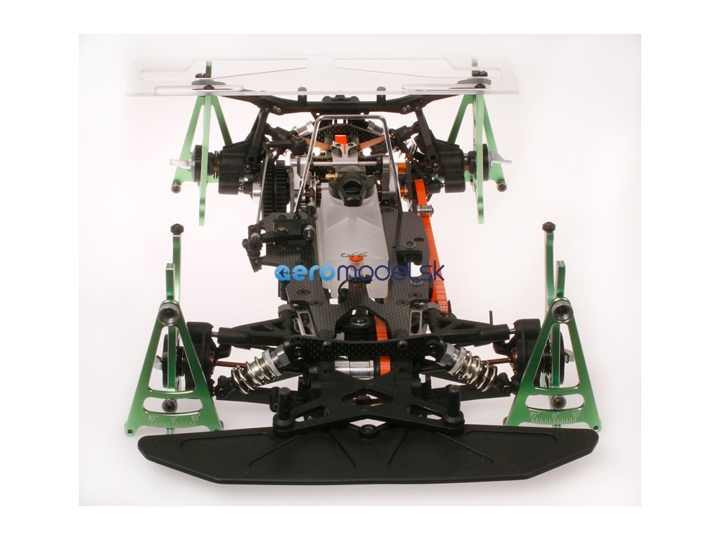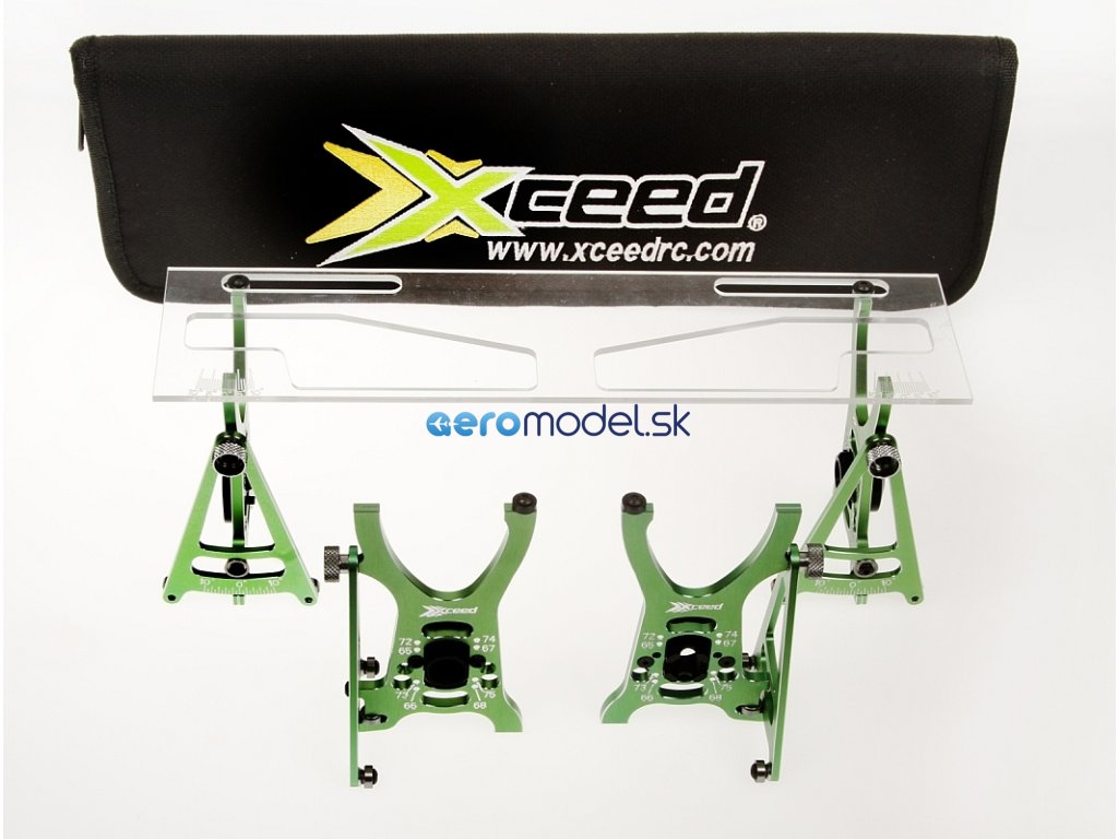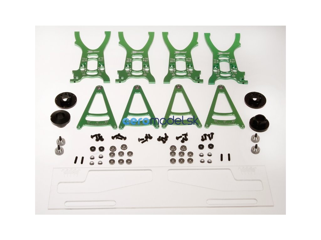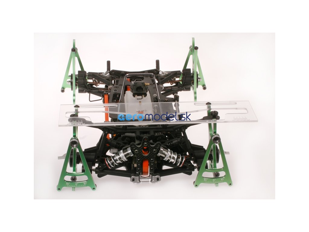 Systém nastavení pro RC aut v měřítku 1/10. Zahrnuje - Přesně opracované hliníkové držáky ve studené zelené eloxaci - Vroubkované matice pro snadnou a rychlou montáž kol - Vysoce kvalitní spojovací prvky - Obráběné nylonové výstředníky pro průměr pneumatiky - Plně uložené v kuličkových ložiskách - Přesné gravírování a značení - Polykarbonátová horní deska - Praktický úložný vak