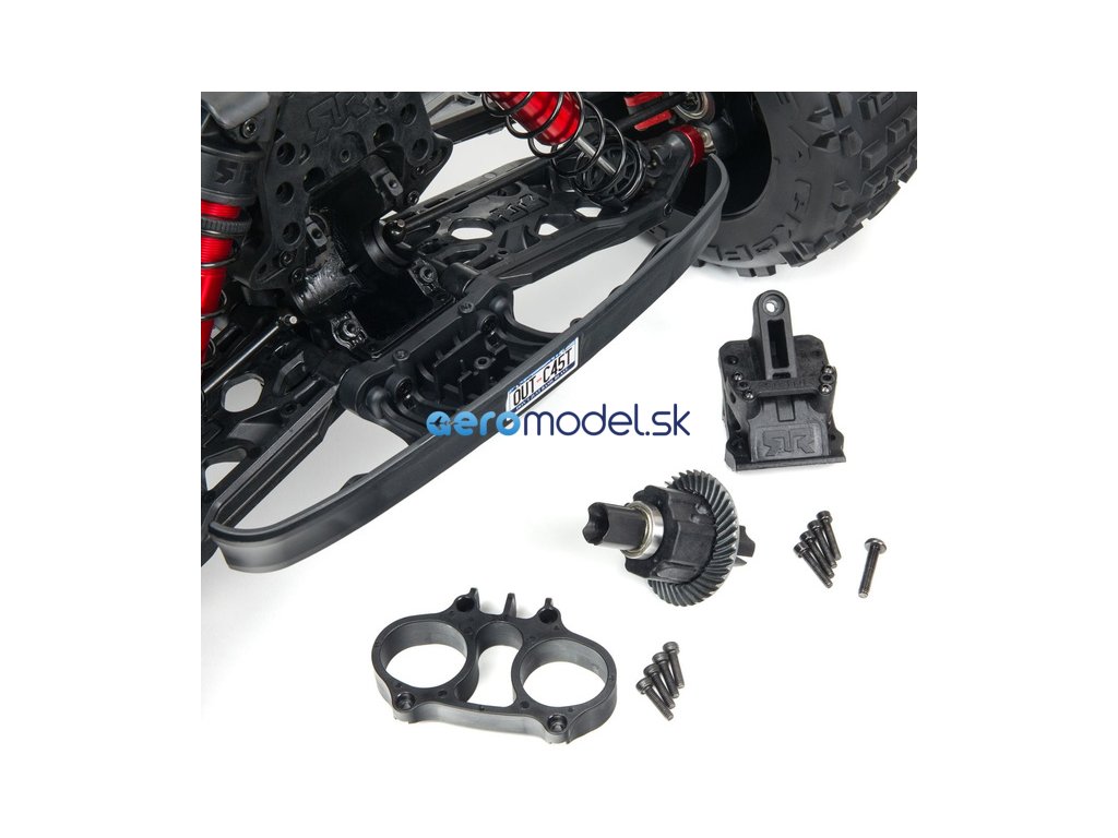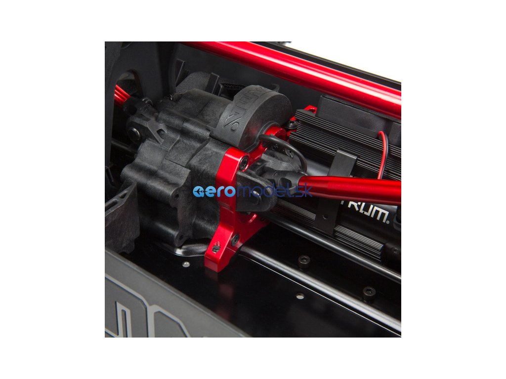 Krásna jablkovo červená karoséria je detailne prepracovaná a vďaka výstužiam vydrží aj divokú jazdu. Vrchné plastové pláty zabraňujú poškriabaniu, rovnako ako podložky praciek, ktoré sú na praktickej gume. Teraz sa už spony nestratia! Rám korby tvorí pevná výstuha, ktorá sa nachádza aj na stredovej veži podvozku, čím poskytuje dodatočnú pevnosť.