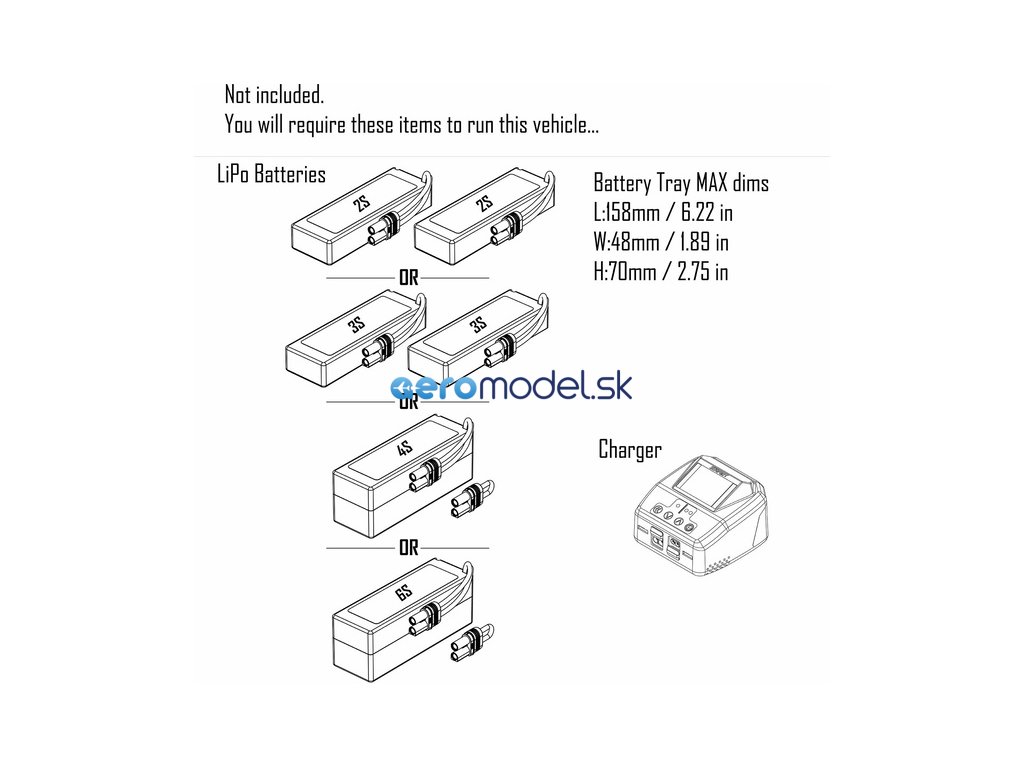 Pro zprovoznění modelu je nutné doplnit pohonný akumulátor a adekvátní nabíječ na pohonný akumulátor.