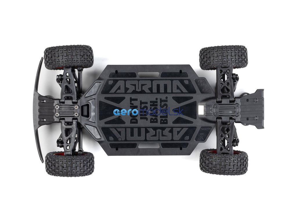 Na pravé straně podvozku je uložena pohonná jednotka, sestávající z motoru ARRMA MEGA 380 28T s mohutným chladičem a integrovaného regulátoru 25A s přijímačem. Nově je mezi komponenty uložen ventilátor pro ještě efektivnější chlazení.