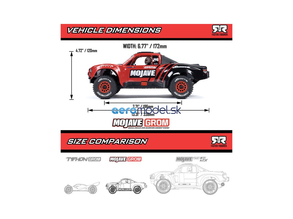 ARRMA MOJAVE GROM 4X4 1:16 RTR je navržen a vyroben podle stejně vysokých standardů, odolnosti a výkonů, jaké očekáváte od RC aut ARRMA. Je jen o něco menší!