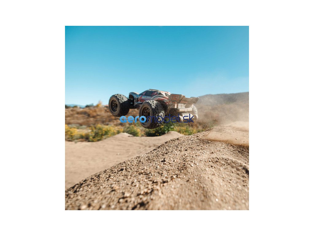 Osvědčená odolná platforma ARRMA® 4X4, vám umožní jezdit vysokou rychlostí téměř v jakémkoli prostředí - v terénu, na šotolině a trávě, na parkovištích i po zpevněných a asfaltových površích. Odolnost šasí vychází ze silného kompozitového podvozku, s prodlouženou výškou chráničů nečistot. Použité kovové převody jsou dostatečně odolné pro střídavý pohon. Výkon je distribuován na jednotlivá kola pomocí přední a zadního diferenciálu. Maximální trakci zajišťují osvědčené pneumatiky dBoots. Vysílač Spektrum SLT poskytuje bezpečný provoz bez výpadků, pro bezstarostnou jízdu jsou na modelu použity voděodolné* komponenty - regulátor s přijímače Spektrum 2-v-1 85A a servo řízení Spektrum S662 s vysokým točivým momentem a kovovými převody.