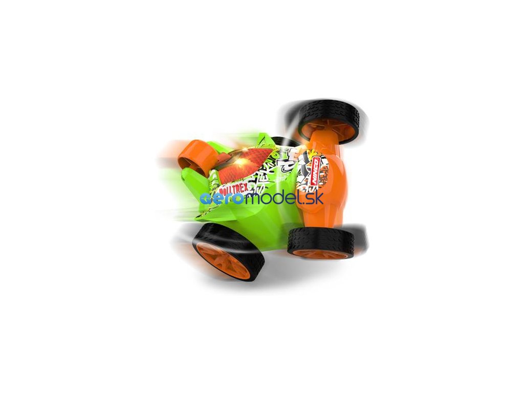Auto na dálkové ovládání NINCORACERS Rolltrex zelený s LED osvětlením v kabině, otočnými předními koly a gumovými pneumatikami. Auto umožňuje jízdu po zadních kolech Wheelie a speciální funkci rotace předních kol. Provoz auta je na pět tužkových baterií typu AA (3ks do autíčka, 2ks do vysílače) (baterie nejsou součástí balení). Vysílač pracuje spolehlivě a bez rušení, či výpadků v pásmu 2.4 GHz.