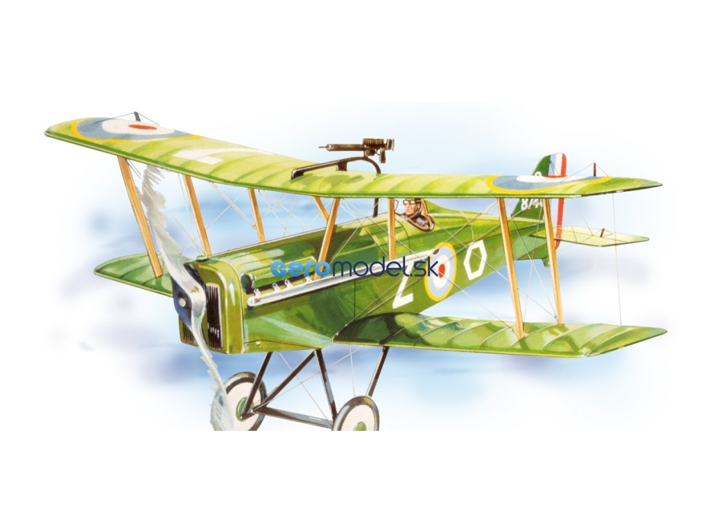 Stavebnice volně létající makety stíhacího dvojplošníku z I. světové války určená pro pohon gumovým svazkem, návod a plán umožňují model postavit také jako volně létající s pohonem spalovacím motorem 0,33ccm nebo jako detailně propracovaný statický model v muzejní kvalitě.