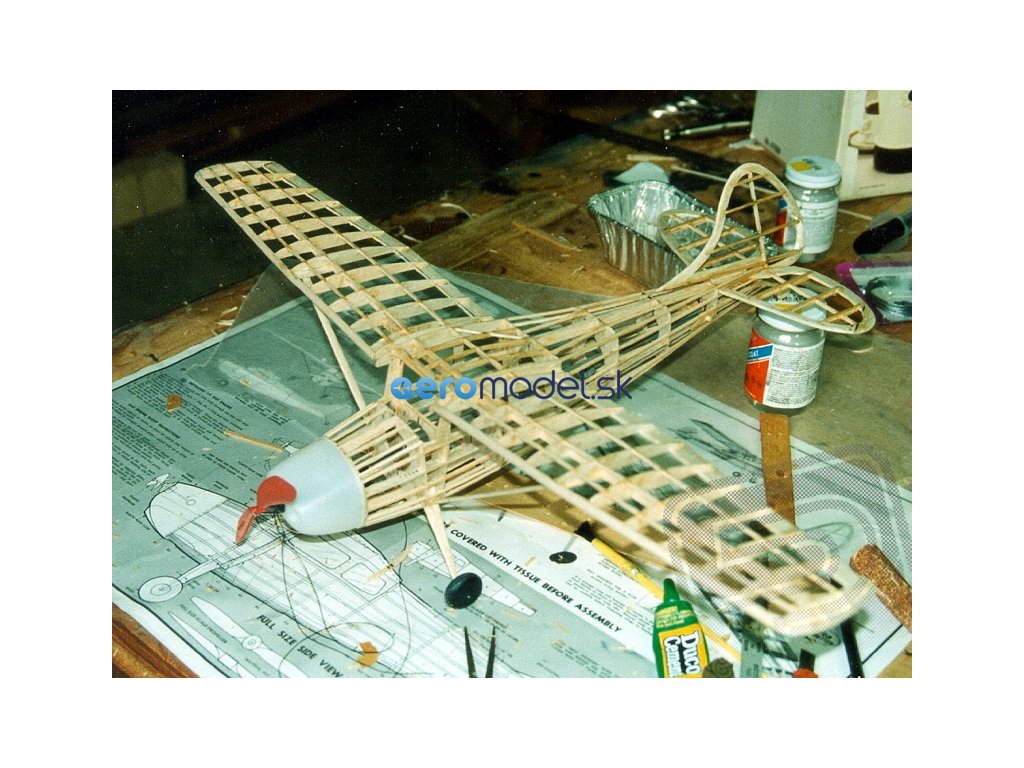 Stavebnice volně létající makety sportovního hornoplošníku určená pro pohon gumovým svazkem; návod a plán umožňují model postavit také jako volně létající s pohonem spalovacím motorem 0,33ccm.