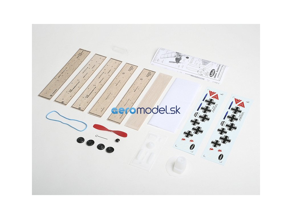 Stavebnice obsahuje: balsové předseknuté díly, balsové nosníky, vakuově lisované díly (kryt motoru, kryt kabiny...), plastovou vrtuli s hřídelí a hlavicí, gumový svazek, kola, ocelovou strunu na podvozek a další drobné díly, potahový papír, aršík mokrých obtisků, stavební plán.