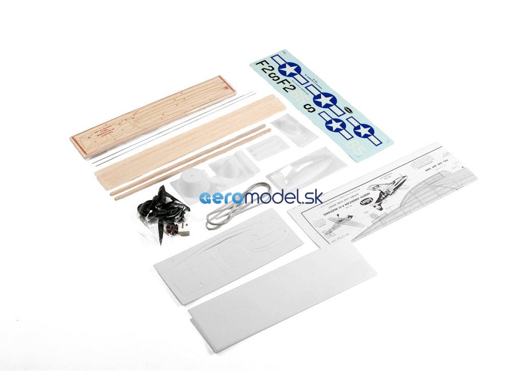 Stavebnice obsahuje: balsové laserem vyřezávané díly, balsové nosníky, vakuově lisované maketové díly (kryt motoru, kabiny...), plastovou vrtuli s hřídelí a hlavicí, gumový svazek (guma 5x1mm), plastová kola, ocelovou strunu na podvozek a další drobné díly, plastová kola, potahový papír,aršík mokrých obtisků, stavební plán.