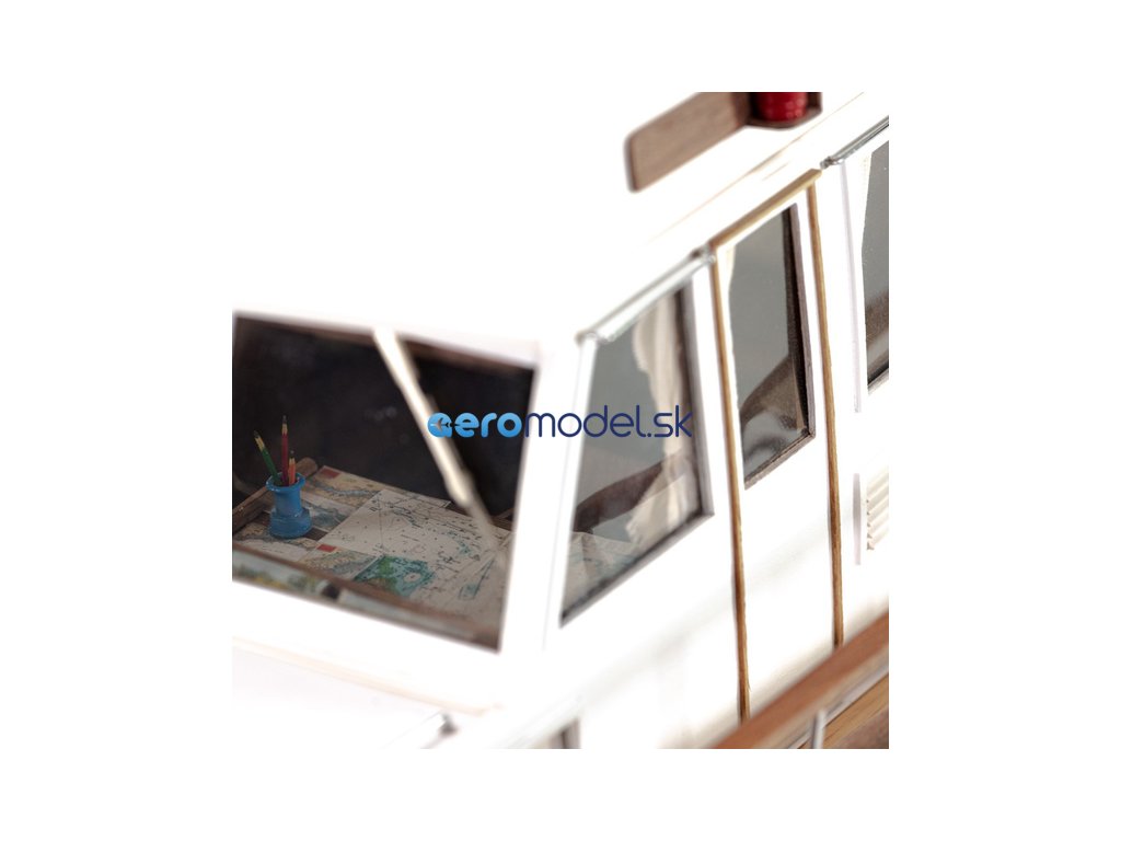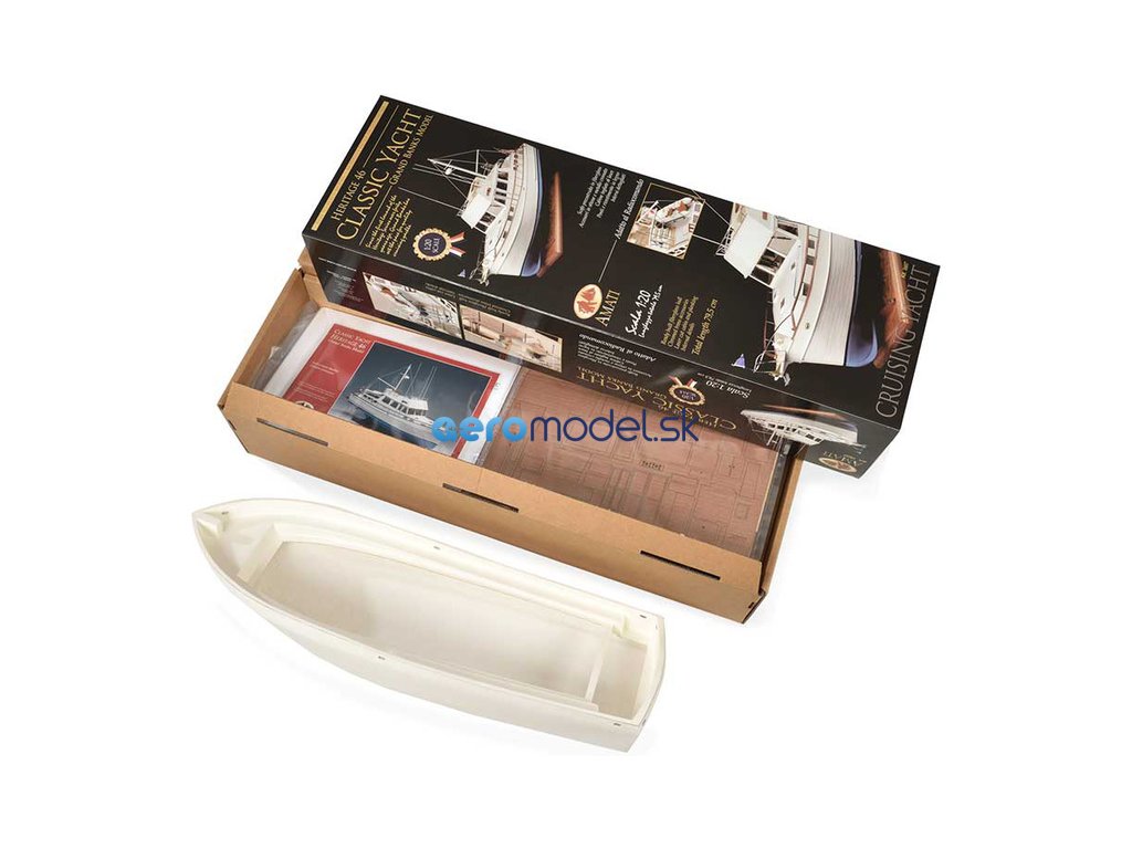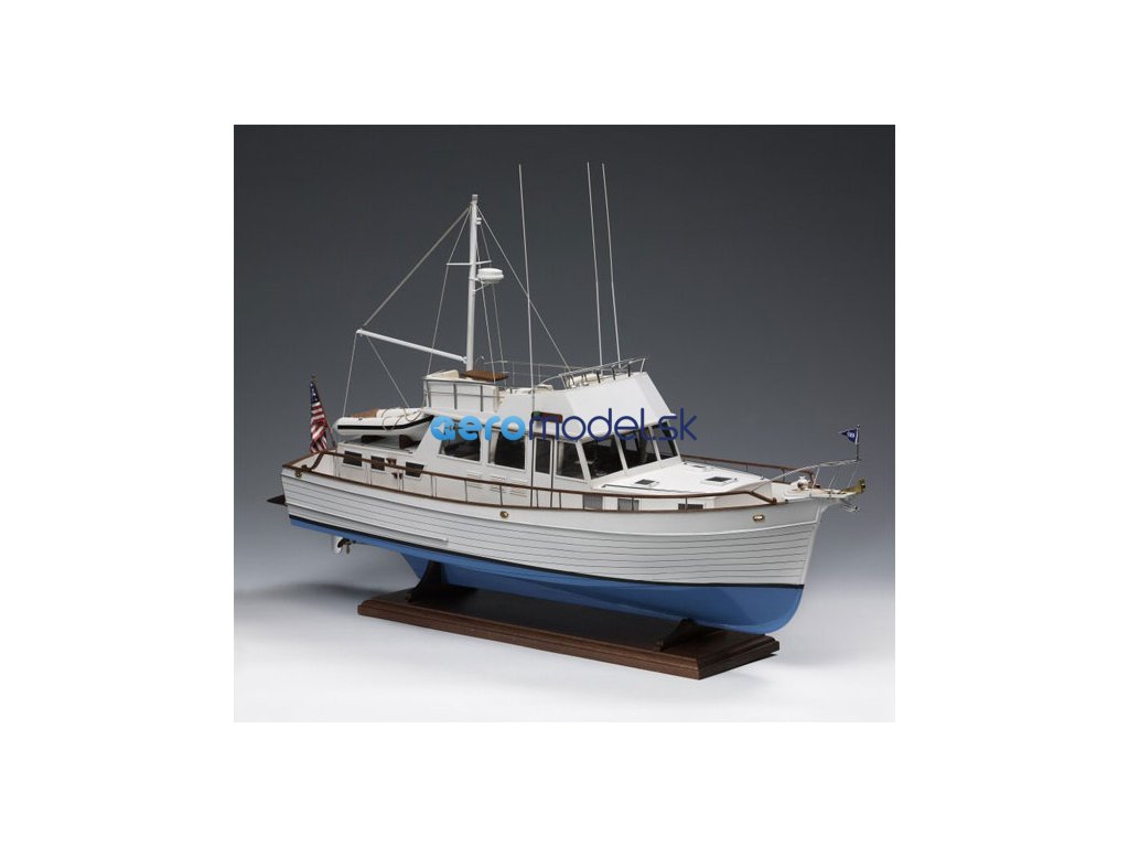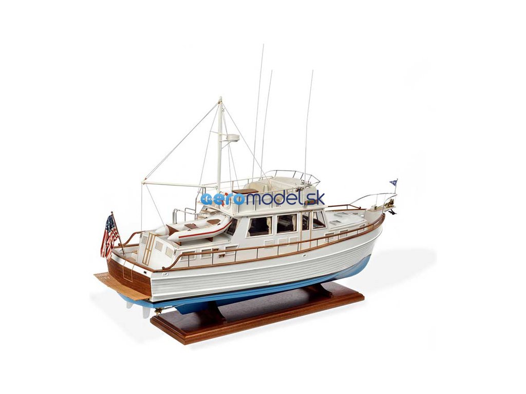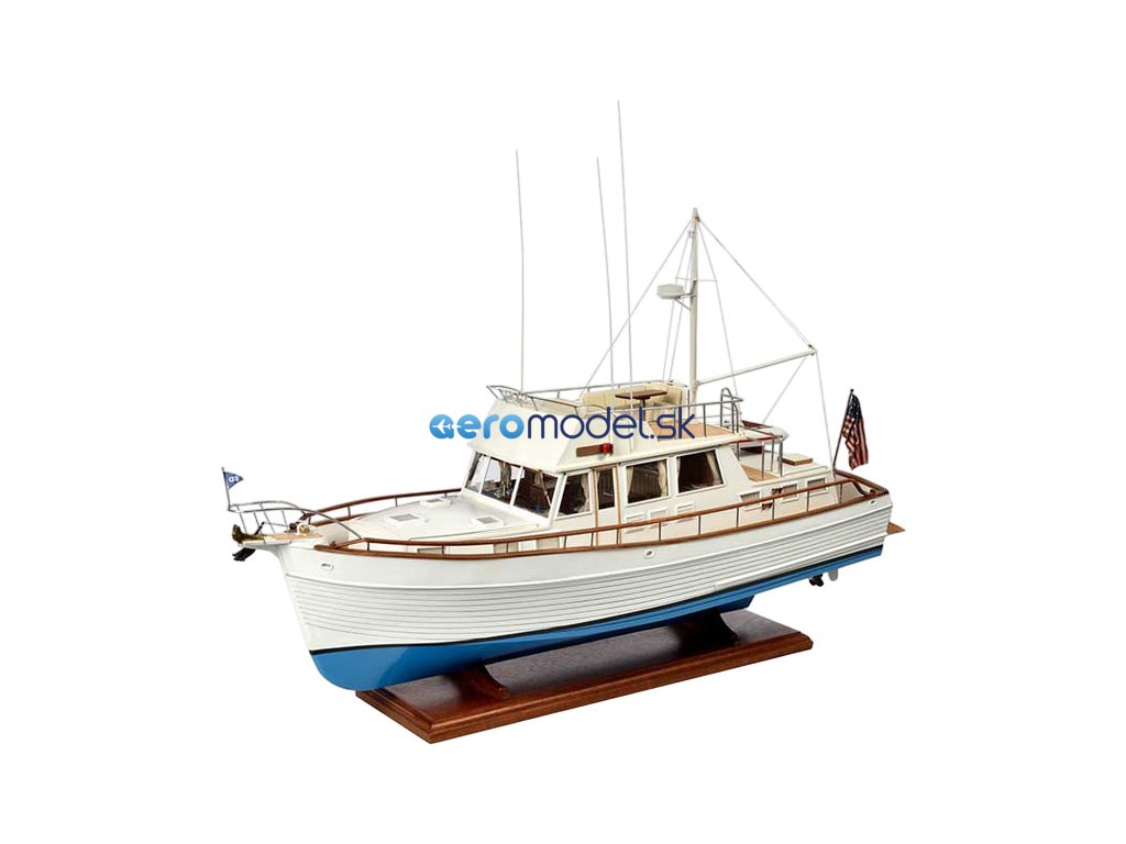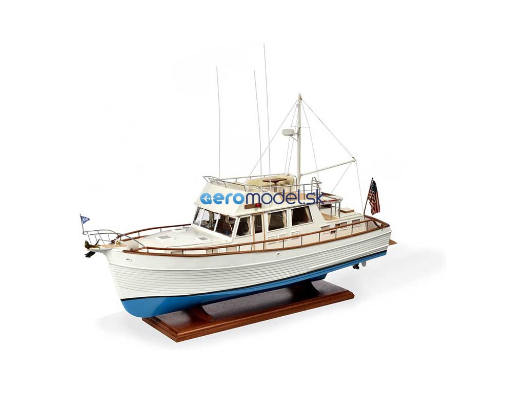 Stavebnice statické makety lodi, AMATI Grand Banks motorová jachta z roku 1967 v měřítku 1:20, kit. Přesný model klasické motorové jachty Grand Banks. V balení je trup z laminátu, laserem řezané dřevěné díly palub a nástaveb a mosazné a kovové díly. Model může být vybaven pohonem KR-25037 a dálkovým ovládáním.