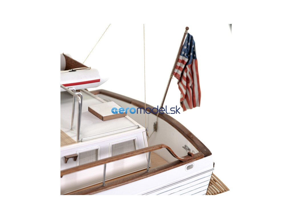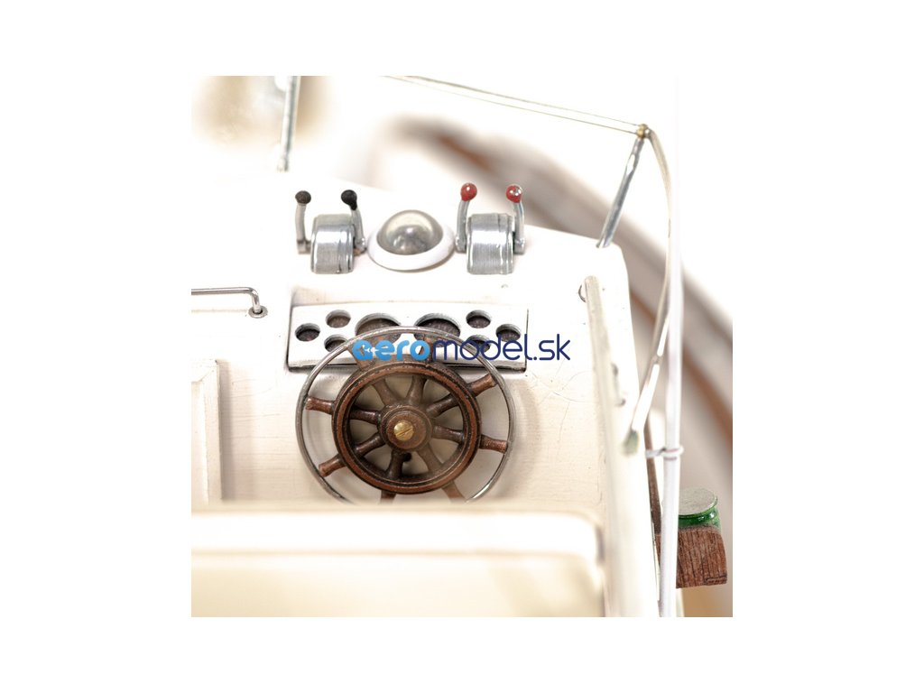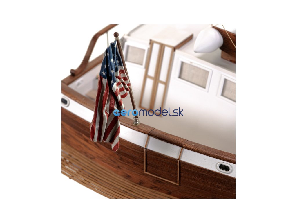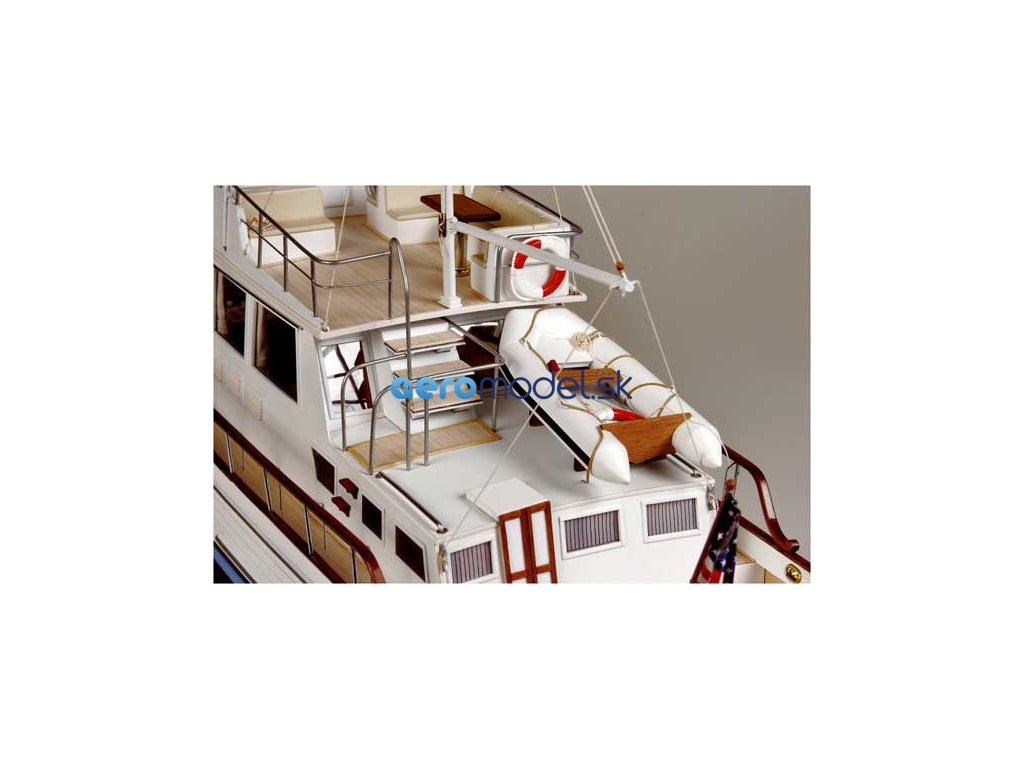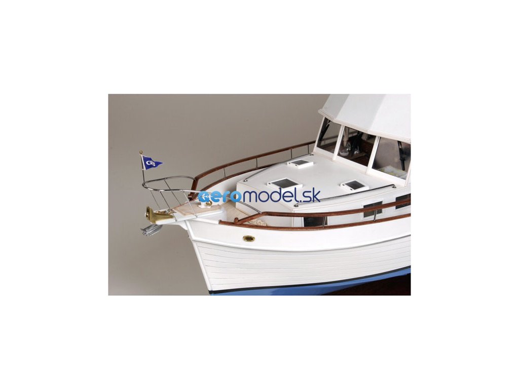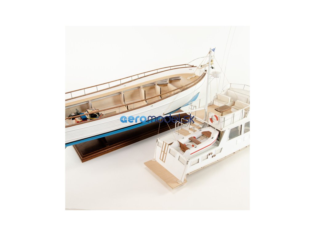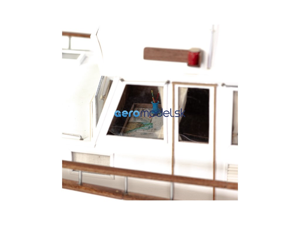 Stavebnice statické makety lodi, AMATI Grand Banks motorová jachta z roku 1967 v měřítku 1:20, kit. Přesný model klasické motorové jachty Grand Banks. V balení je trup z laminátu, laserem řezané dřevěné díly palub a nástaveb a mosazné a kovové díly. Model může být vybaven pohonem KR-25037 a dálkovým ovládáním.