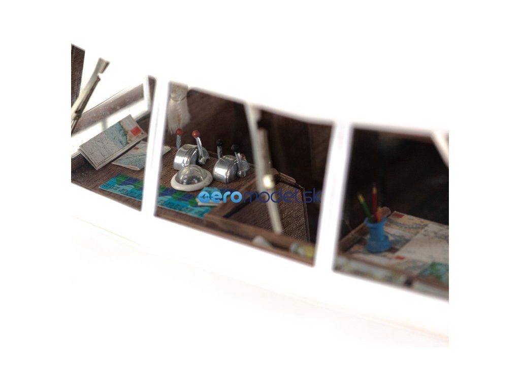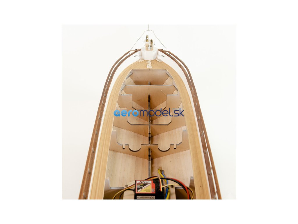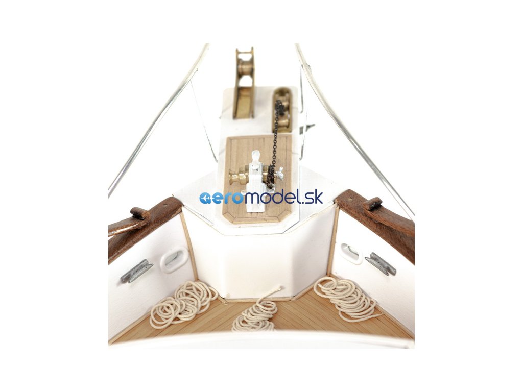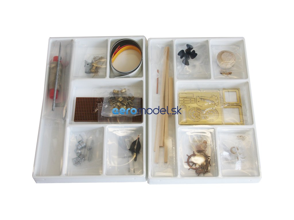 Balení obsahuje sadu desek s překližkovými díly, sadu nosníků, nabarvený laminátový trup, blistry s drobnými díly, model člunu, maketové součásti kabiny, materiál na plachty, drátěné součásti, papírové dekorace, obsáhlá sada výkresů, obrazový manuál.